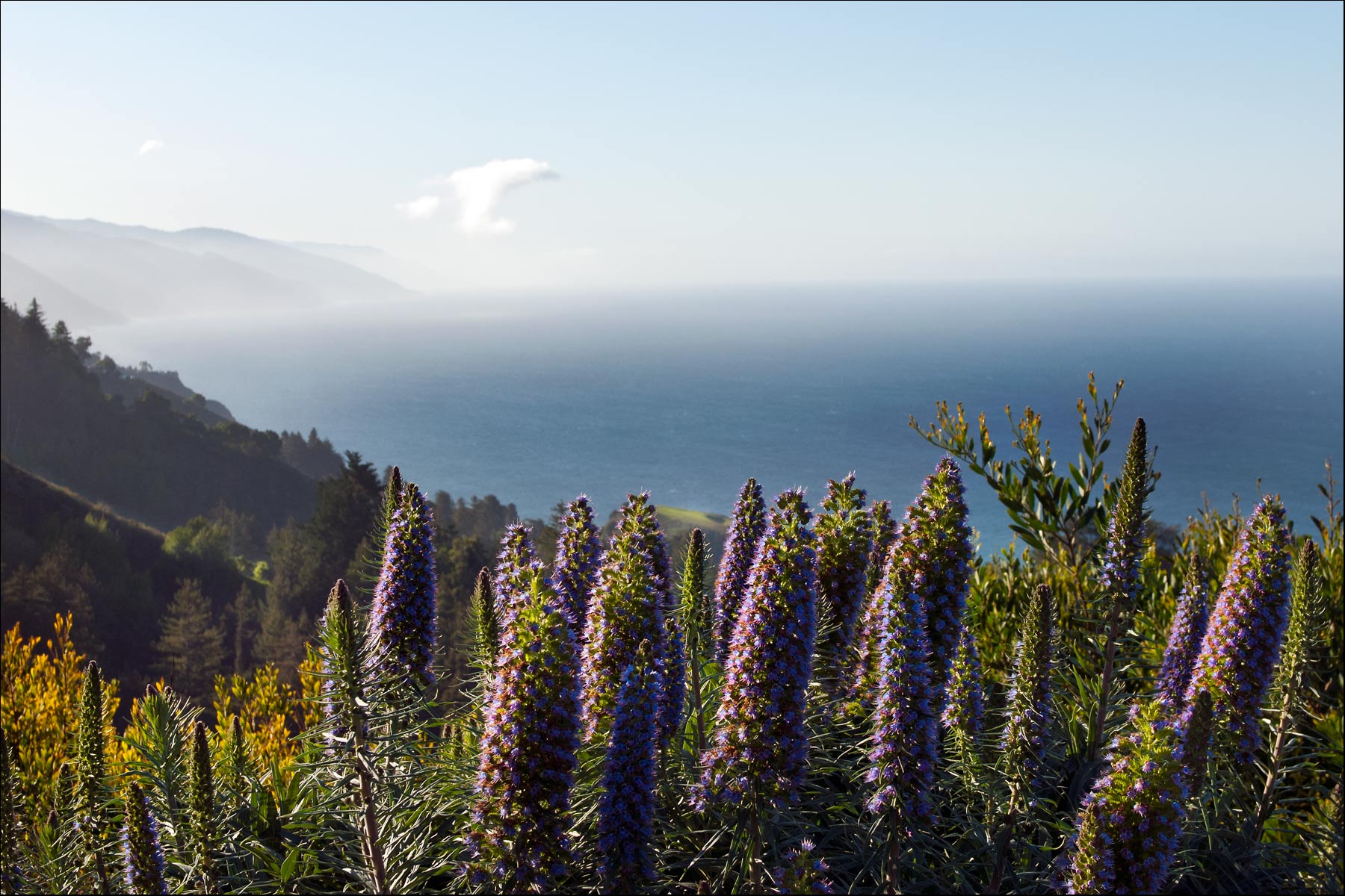 Looking out through a patch of lupines into the Pacific ocean on beautiful spring morning with just a touch of fog to make things interesting.