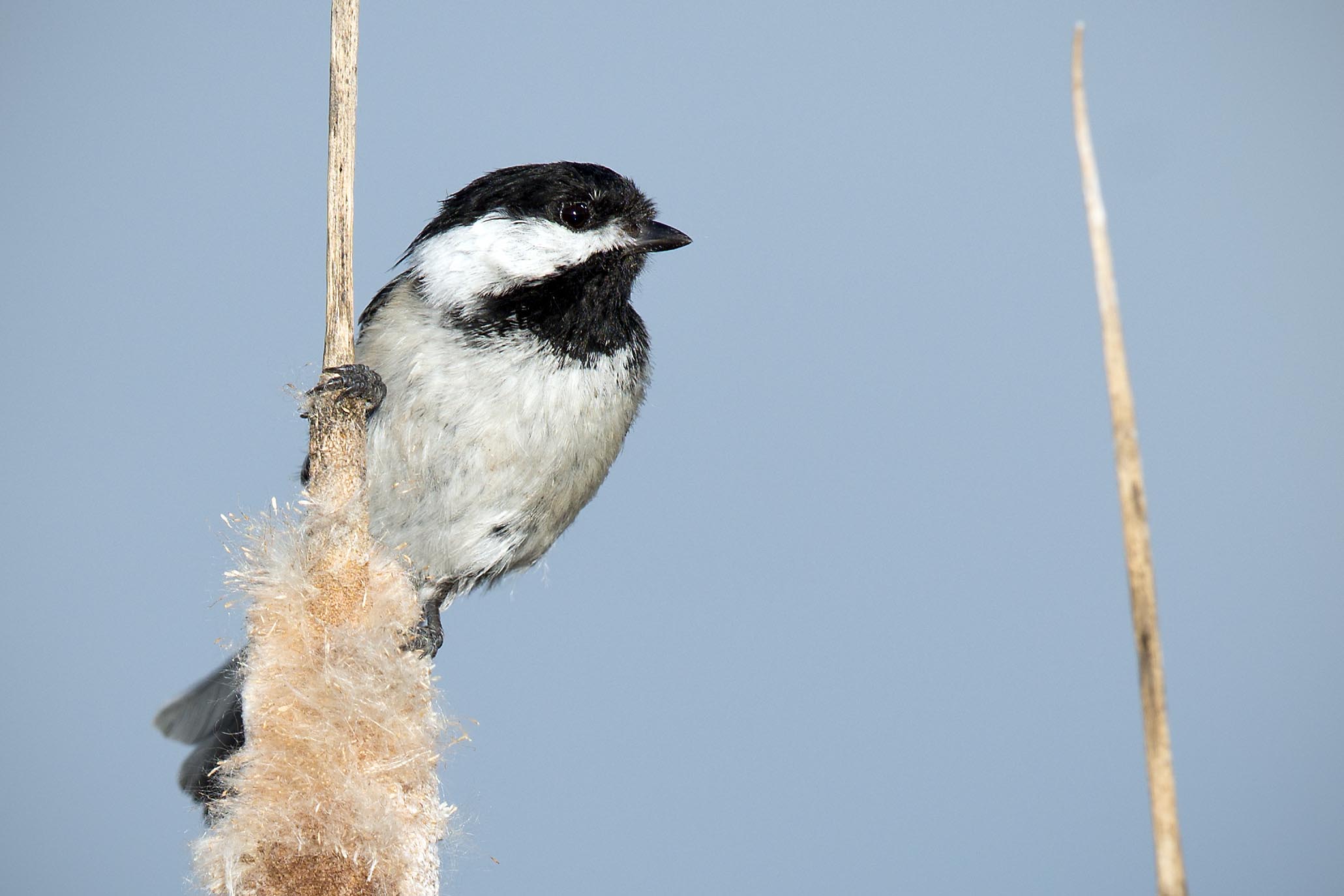 Nothing better in the morning that sitting with you cup of coffee and listening to the chikadees calling back and forth. This good looking bird was picking through the cattails and having a great time.