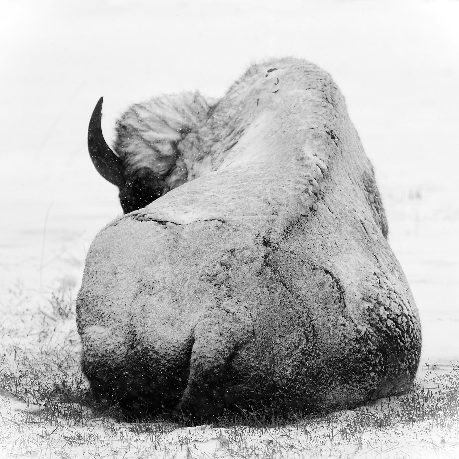 But in this case the shelter comes with you. An American Bison, with a wonderfully adapted coat, waiting out a day of snow in Yellowstone National Park this winter.