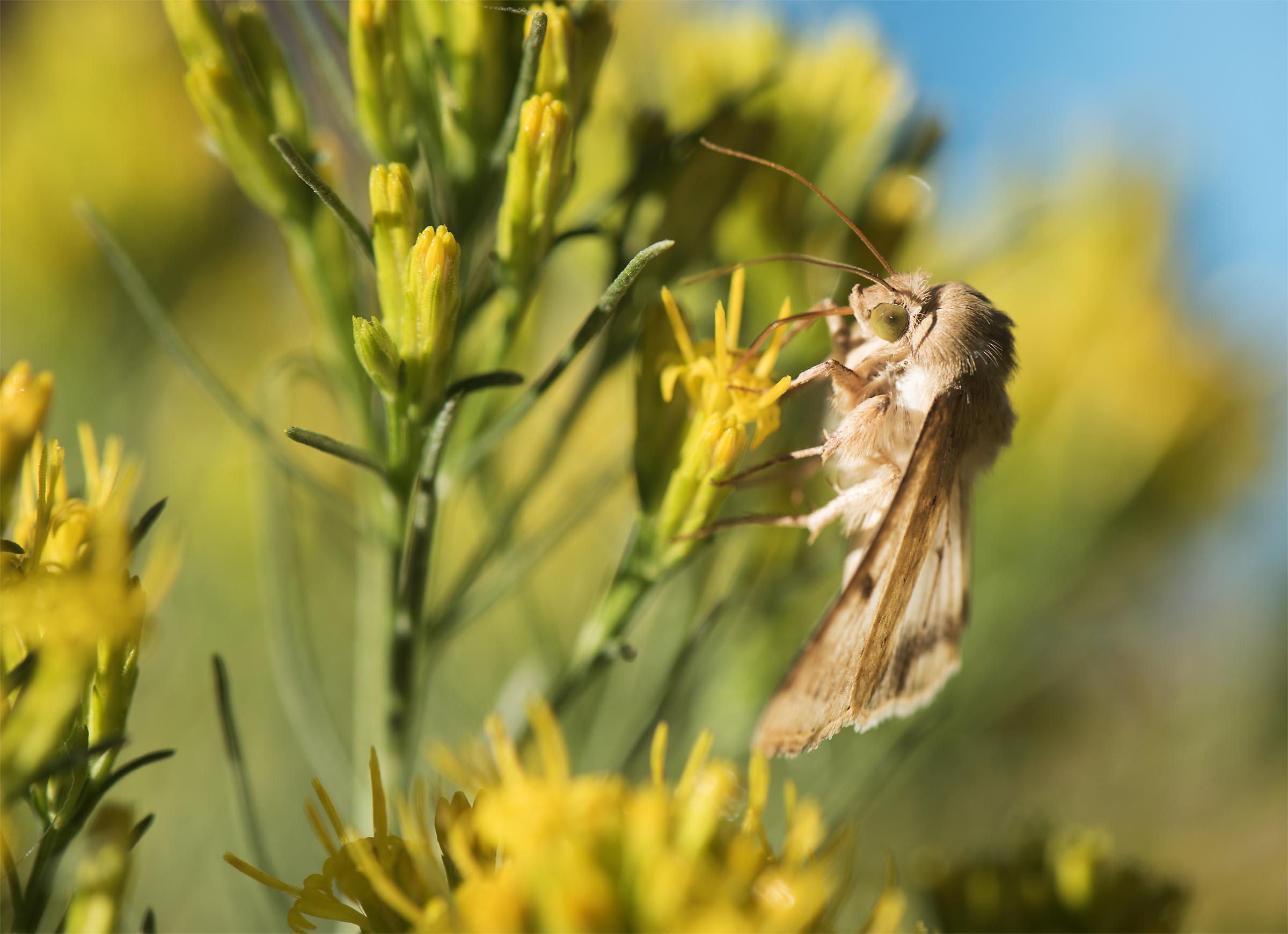A corn ear worm moth spending time with one of our favorite late bloomers in the area the Rabbit Brush plant. Love the beautiful yellows of this plant in bloom and it looks like the moth does as well.