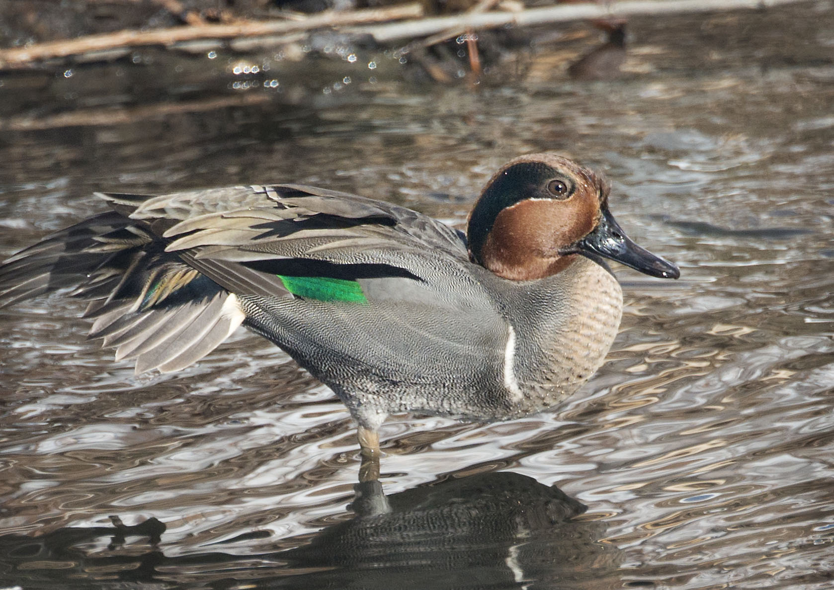 Each winter we await the arrival of the waterfowl which overwinter on the creeks in our vicinity. One of the duck species I always love to see on the creek is the diminutive Green Winged Teal which are the smallest dabbling ducks in North America. This male caught our eye the other day allowed us a few quick photographs before making his way downstream.