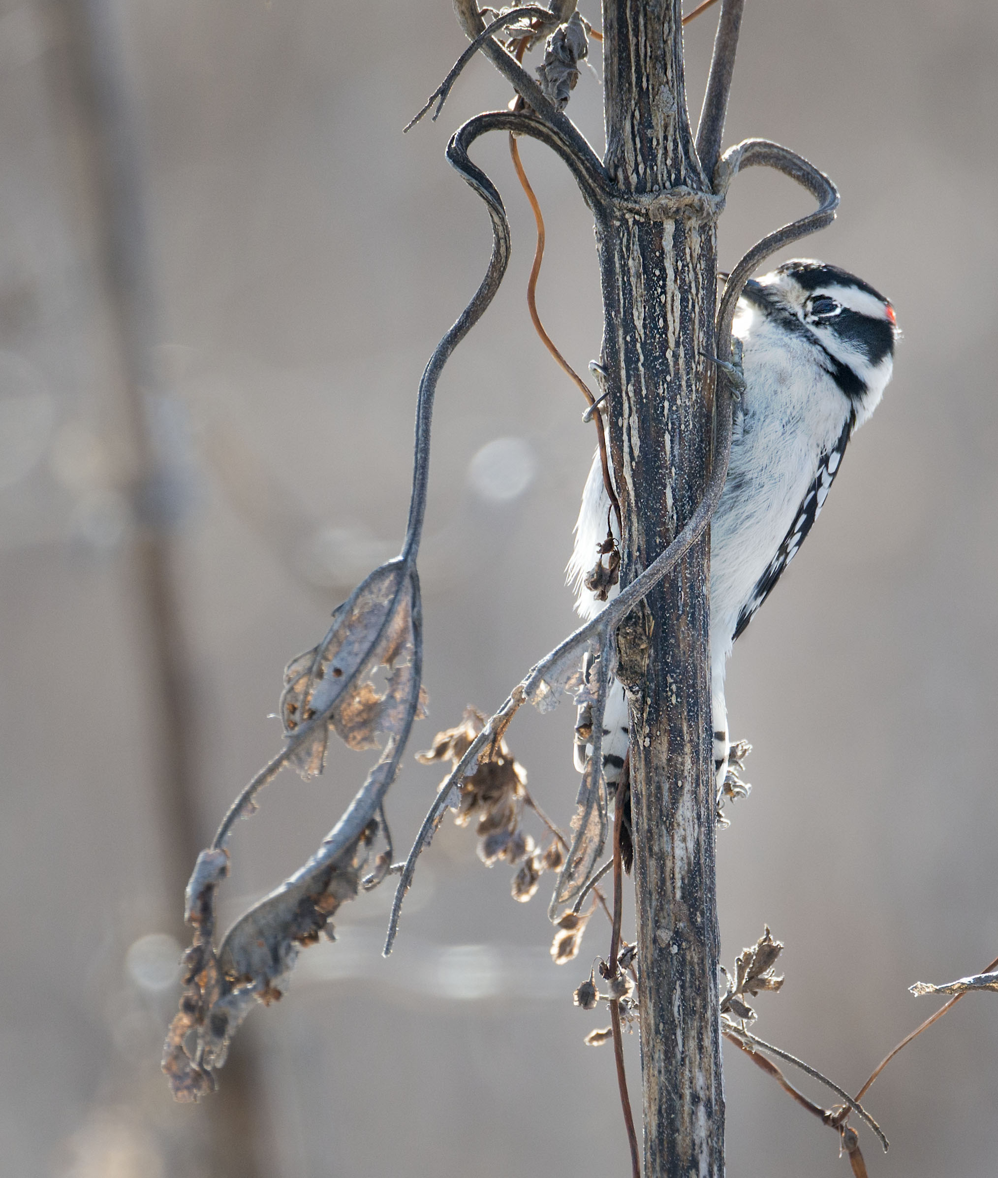 A male Downey Head Woodpecker looking for a meal on a dried stalk of dried queen Anne’s lace Usually we see these guys scurrying about in the much larger trees pecking away looking for a meal. This day we were surprised to hear the pleasant pecking of a downey head on this small plant. Surprises do come in small packages.