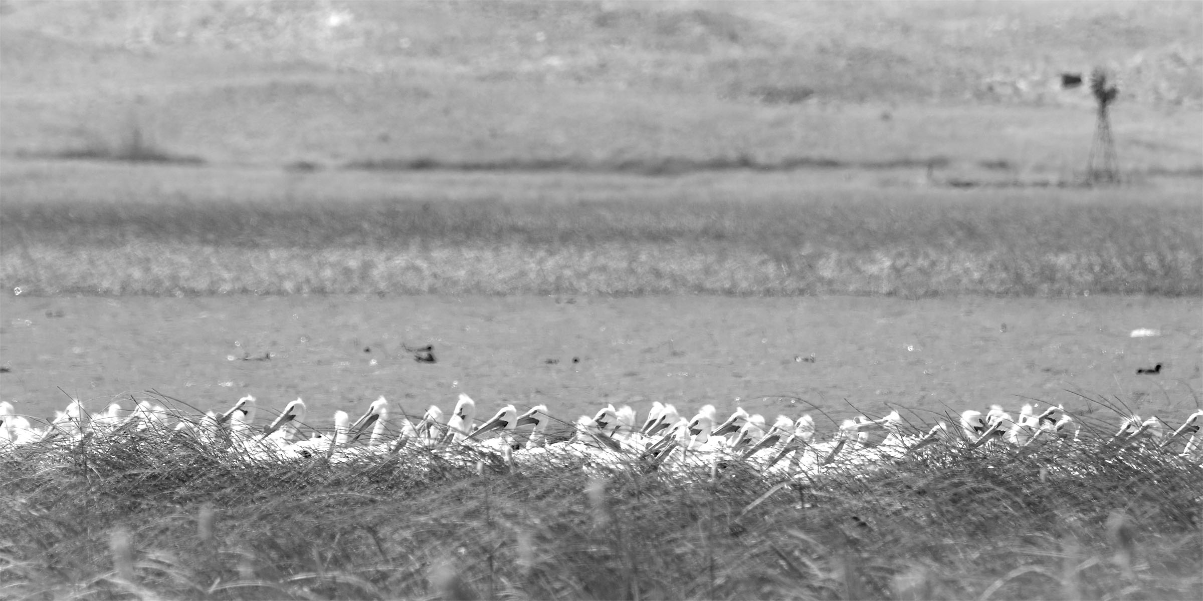 Pelicans held flightless by gale like winds share a lake with old windmills and dusty dry hills.