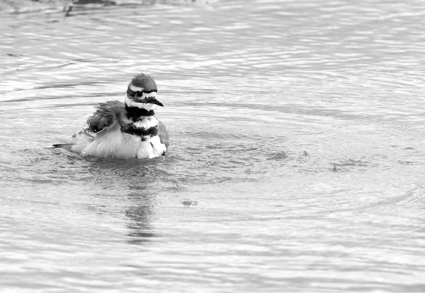 A Killdeer finds a quiet spot in a temporary pond along a country road for a leisurely afternoon bath.