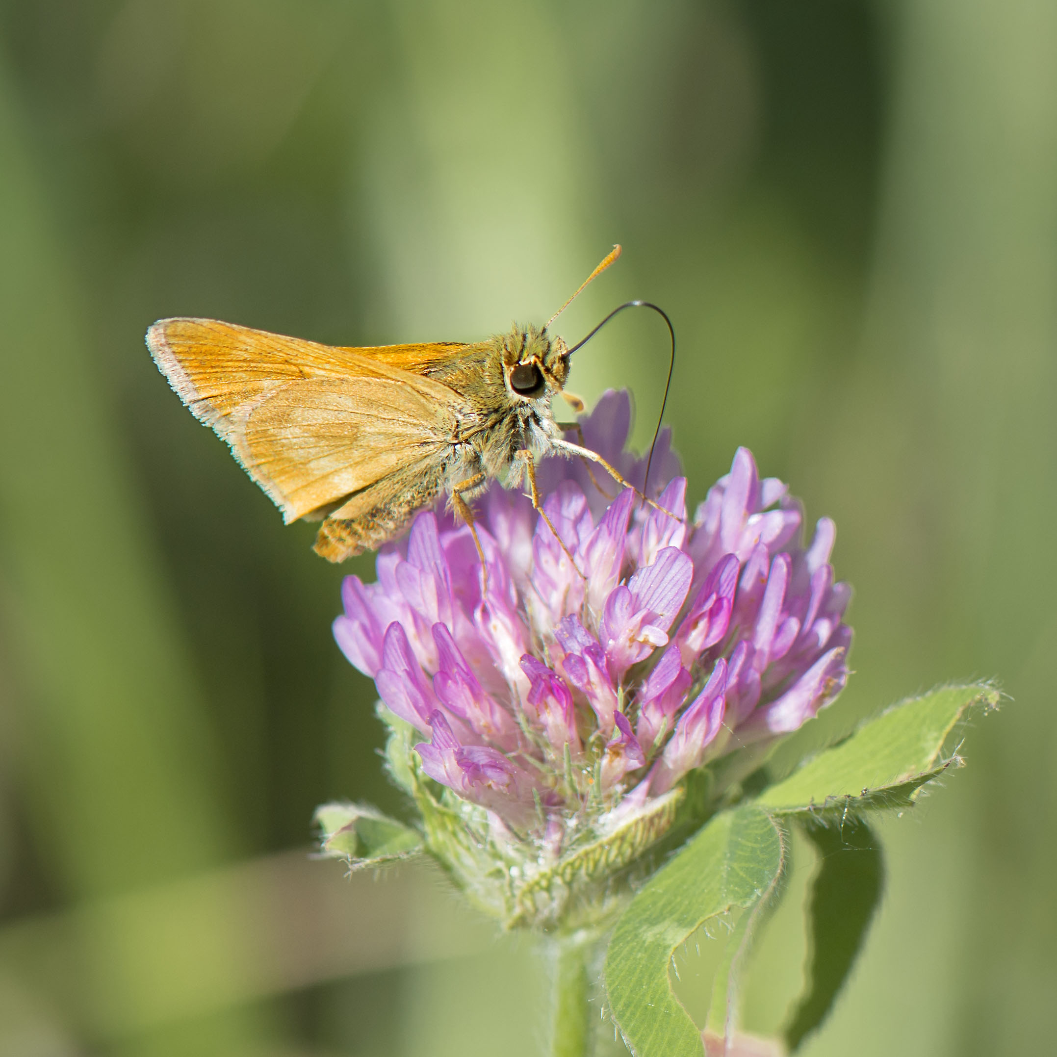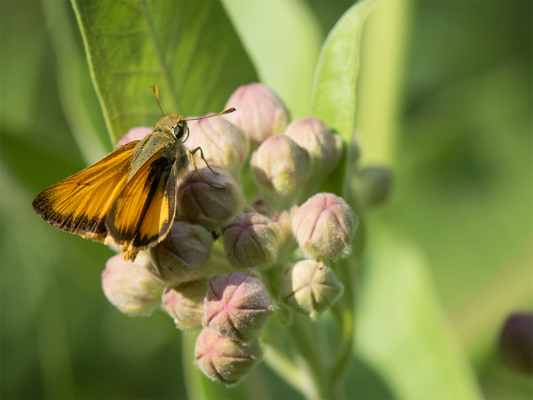 A Little Orange Skipper sampling the summer buffet of flowers. First on the clover and then on the milkweed as the late afternoon sun begins to turn the clock on another beautiful day.