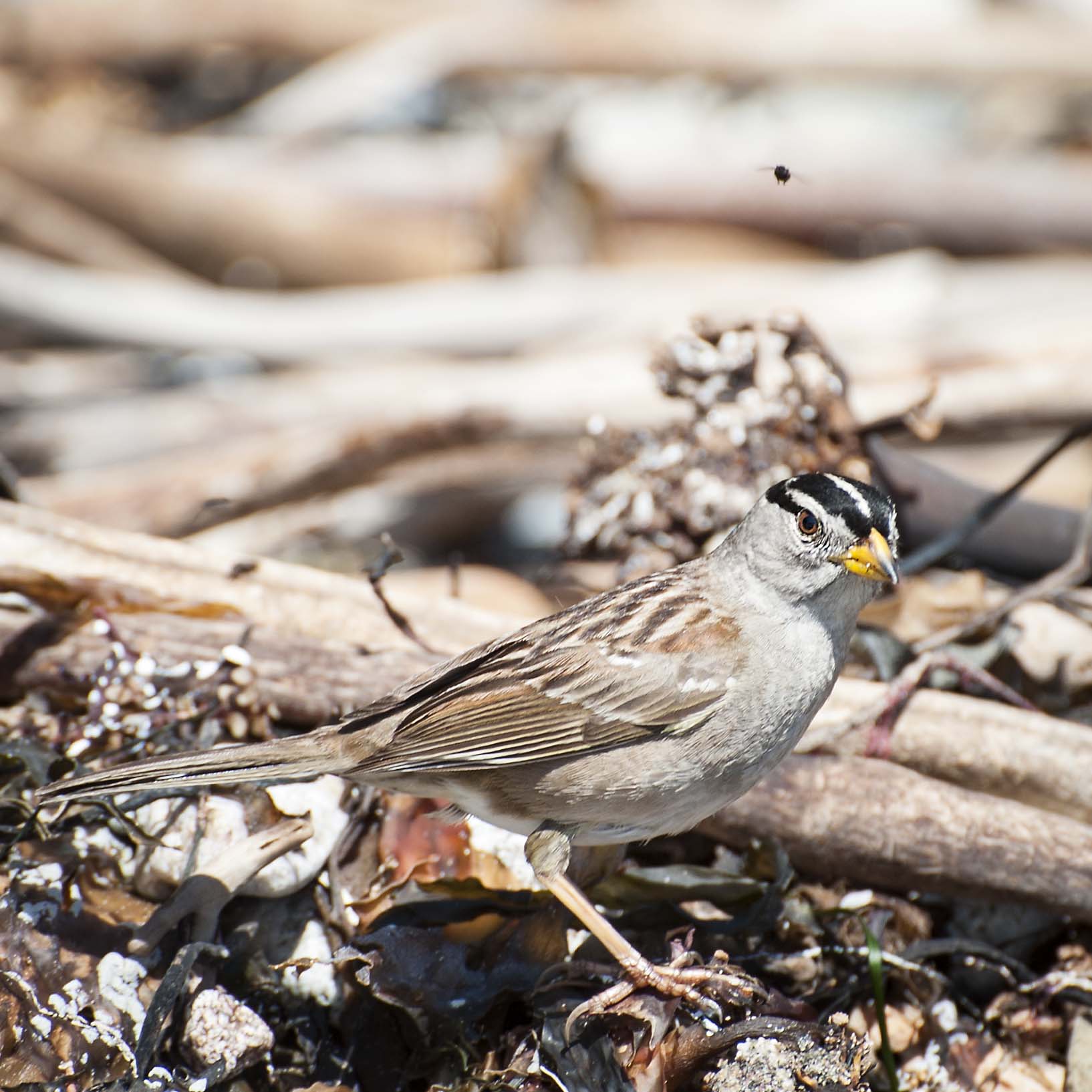 A White-Crowned sparrow searching the sea wrack for his next tasty meal. Little does he know one is lurking right over his head. Photographed on the Northern California Coast.