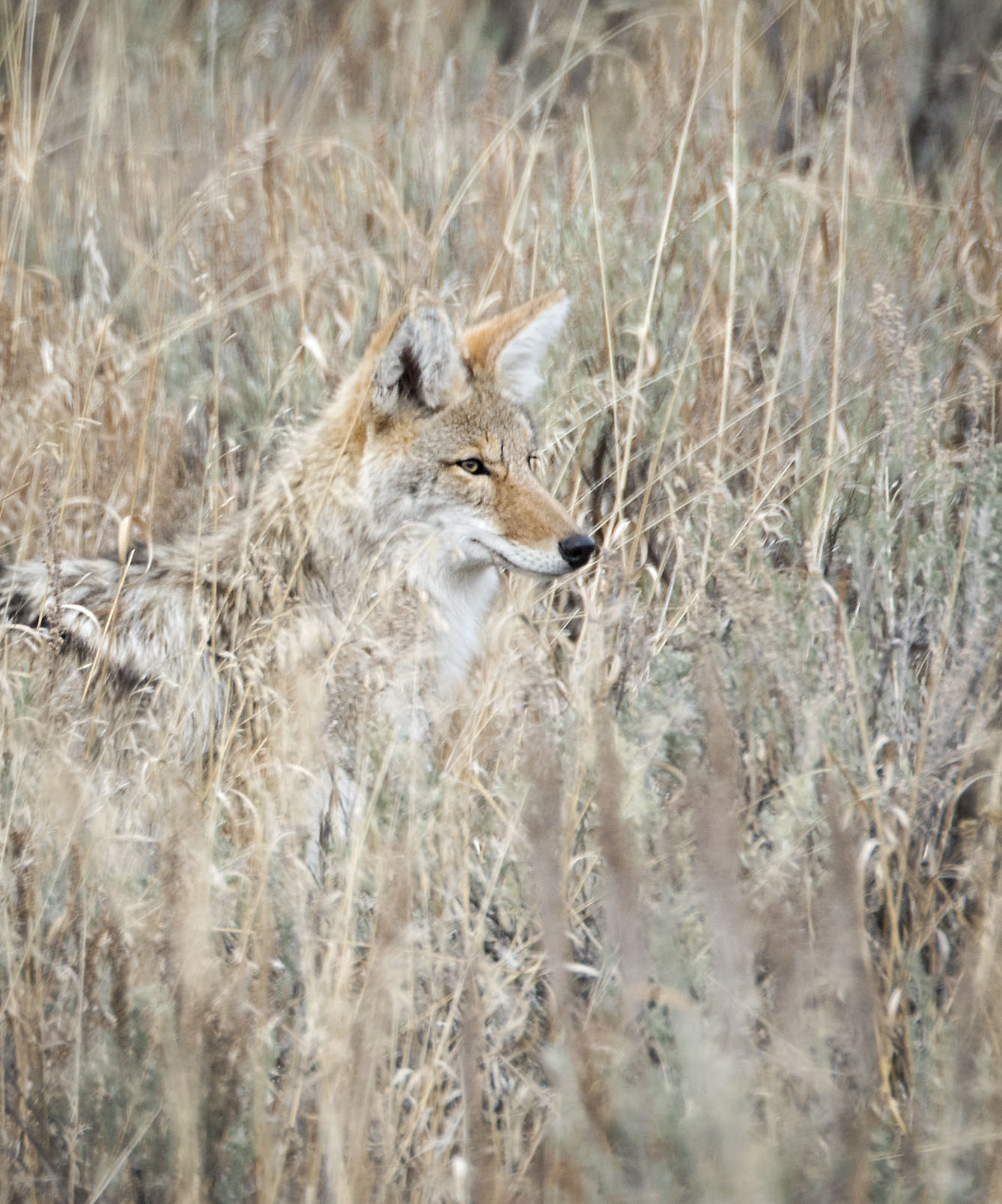 Well dressed for a late fall hunt a Coyote silently stalks their prey in the deep grass.