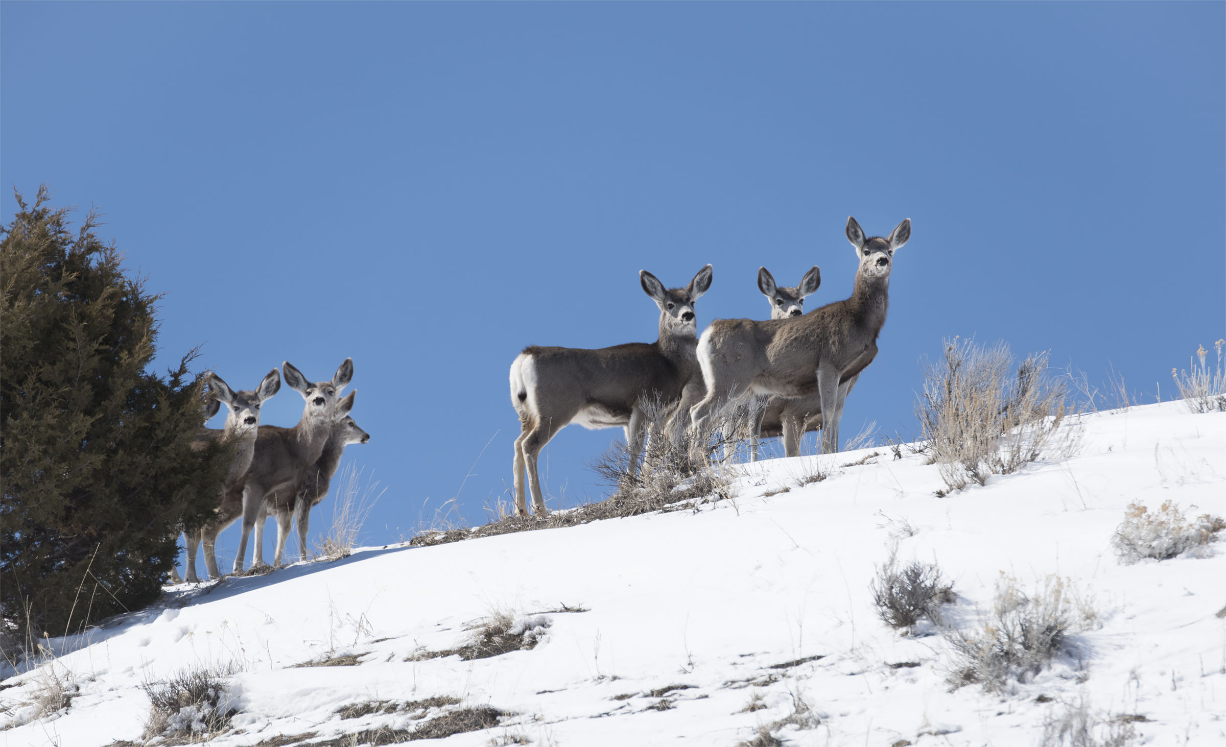 A nice group of Mule Deer peek out from behind the juniper on a wonderful bluebird day as the snow slowly melts away on the sagebrush covered hills. A welcoming sight on a wonderful early spring day.