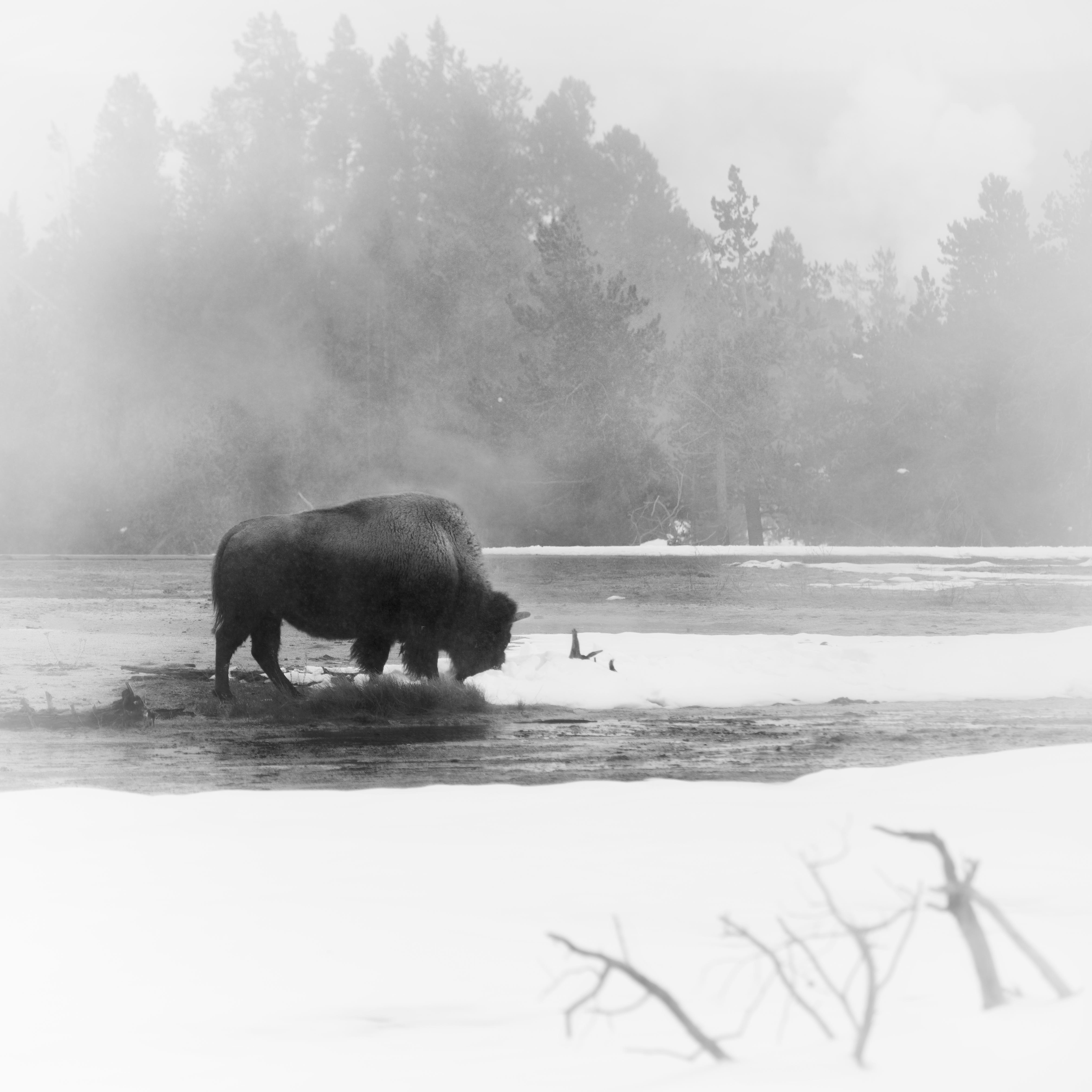 An american Bison making the most of a thermal feature to graze upon some winters growth in Yellowstone National Park.