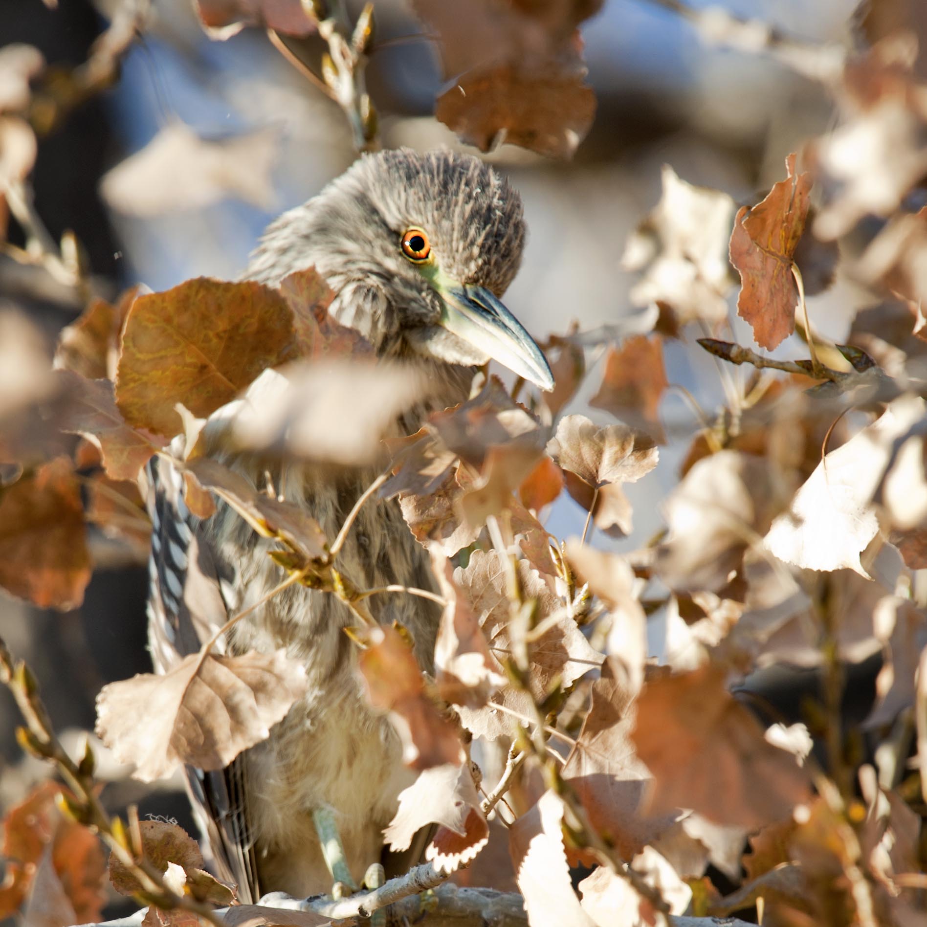 A juvenille Black Crowned Night Heron is taking a break from his fishing but still keeping an eye on the water below while perched in an old cottonwood tree along clear creek in Denver, CO. He sure looks good wrapped in those fall colors.