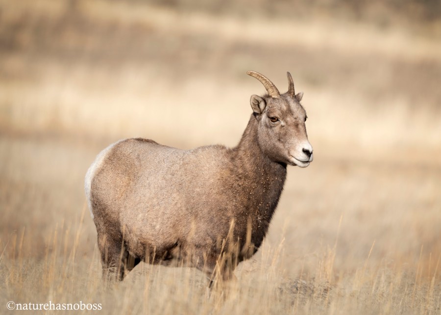 While the big guys with the full curls were somewhere up in the hills above these two teenage Bighorn Sheep descended the hills, made their way through the sage brush, and then headed our direction across the grasslands below. A bit wary, yet curious, they confidently approached little by little.