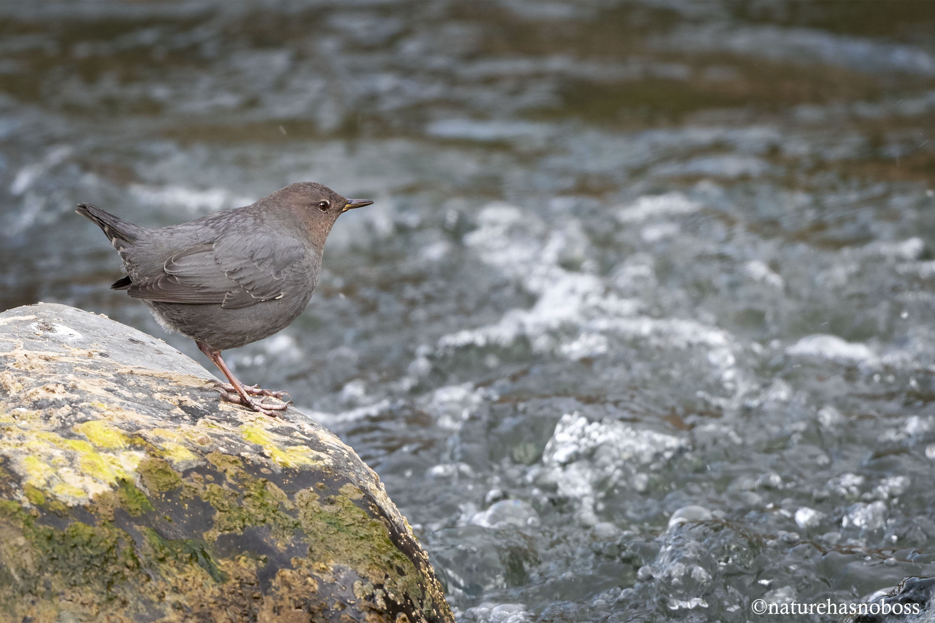 An American Dipper getting the big view before taking the plunge into the icy winter water below. American Dippers forage along the rocky river bottoms of rapidly moving streams of western North America. Diving in and out and running along the bottoms of the river at times to feed on a variety of aquatic invertebrates. In addition to their fascinating foraging behavior American Dippers have quite a song and really can belt out a wonderful tune making a hike along a rushing stream a full on audio-visual delight.
