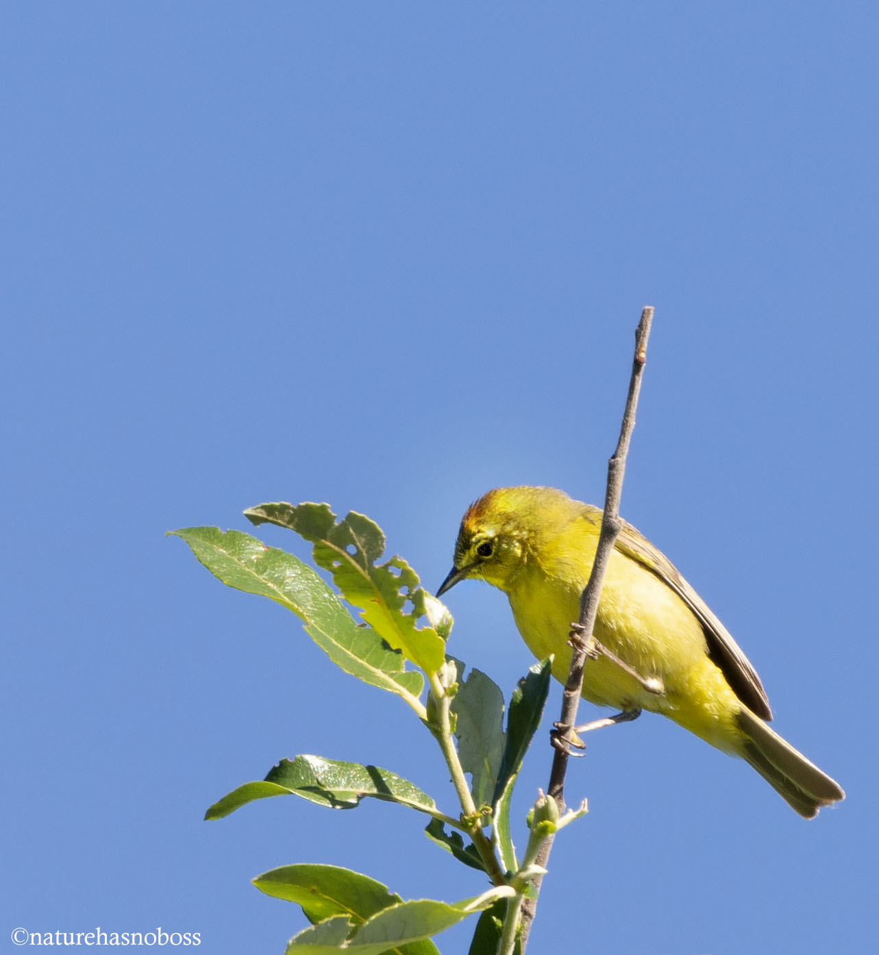 An Orange-crowned Warbler with orange crown actually showing forages high up in a stand of shrubs with nothing but a blue sky behind.