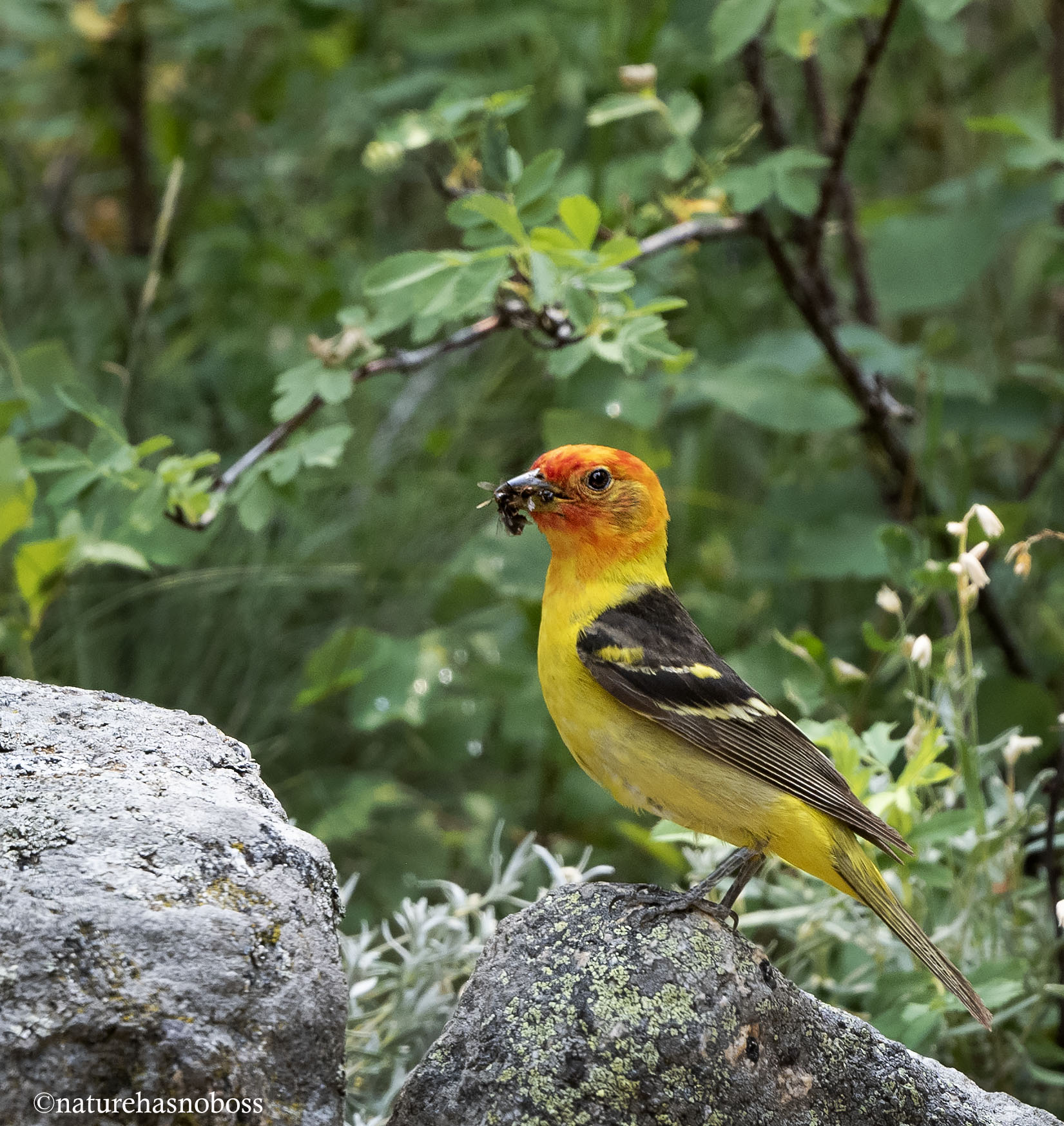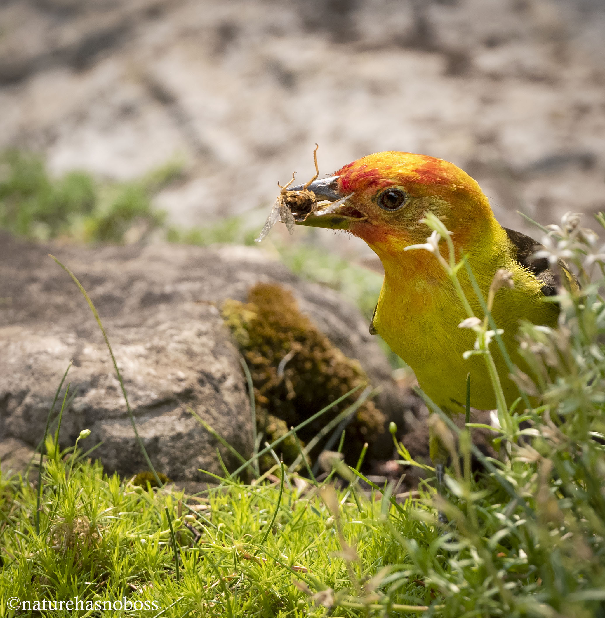 With a brood to feed this male was busy collecting mouthfuls of flying ants to bring to the nest. We watched him make several trips to an ant nest a black bear had recently exposed behind a pile of rocks.