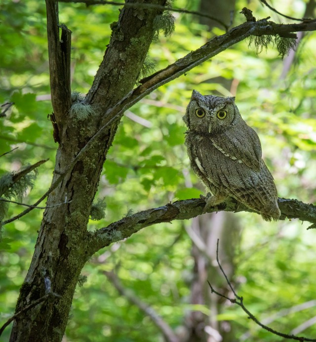 This little guy surprised us by flying down and landing right in front of us while we were walking in a dimly lit forest. We are not sure if it is a Western or Eastern Screech Owl as both are commonly seen in our area and we only got a couple of photos before he flew off further into the woods. A nice little surprise on a summer afternoon.