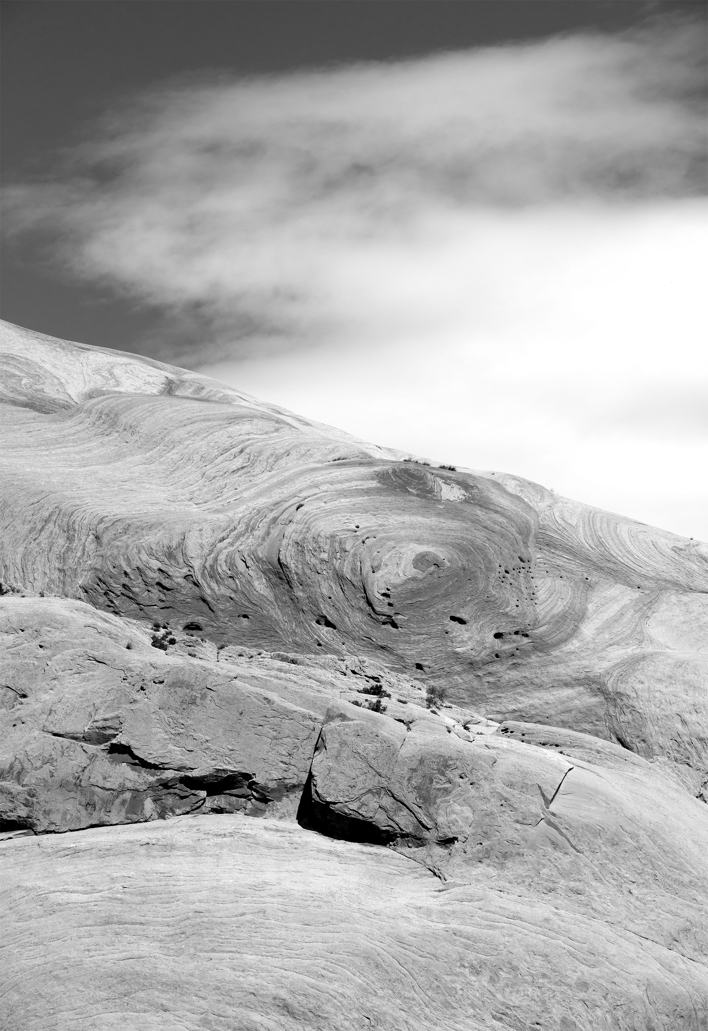 Up on the rim of Pollack Canyon looking towards Utah from the spine of a sandstone ridge. Wispy clouds roll across the sky on an early spring afternoon in the high desert near Fruita, CO.