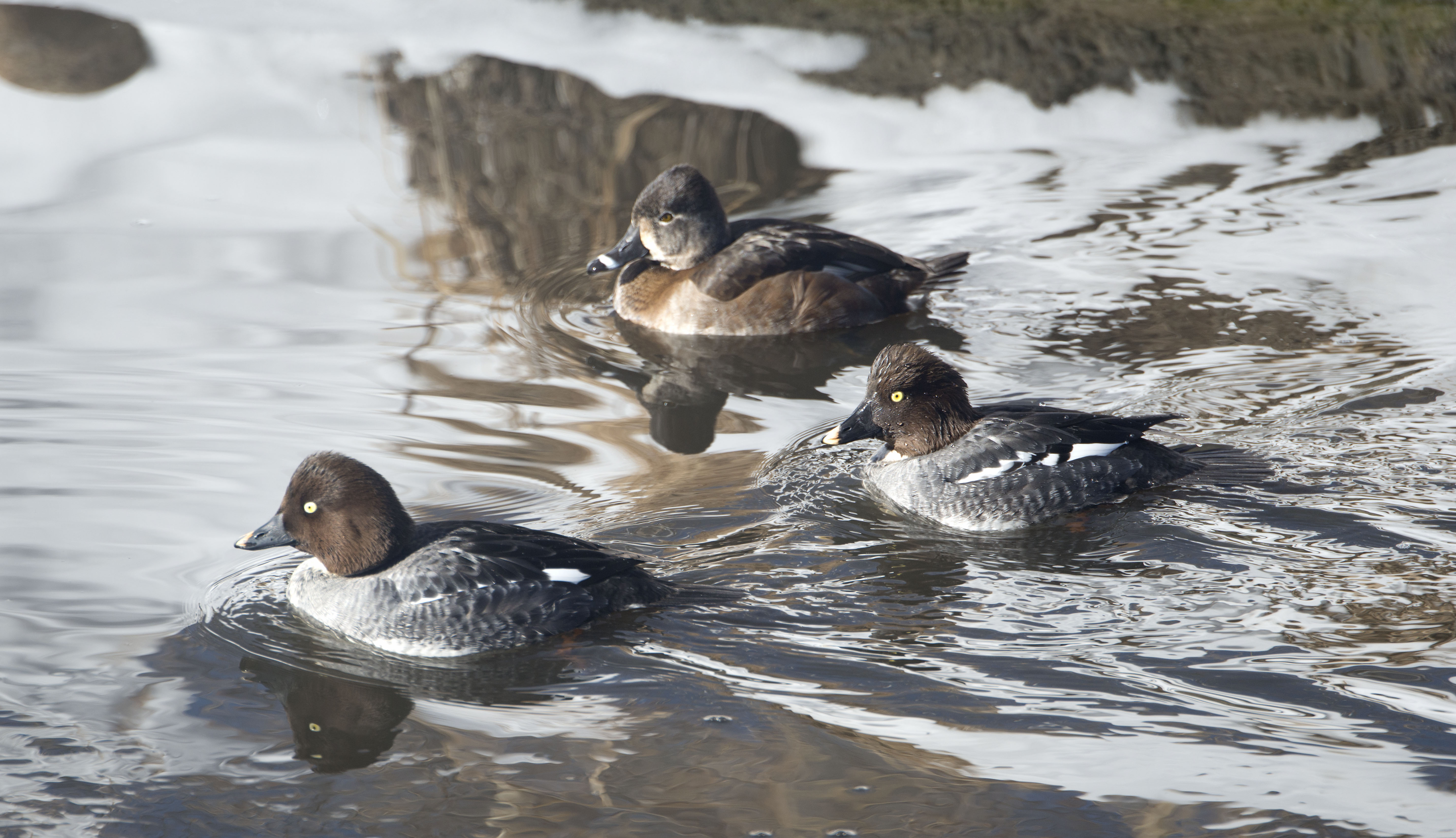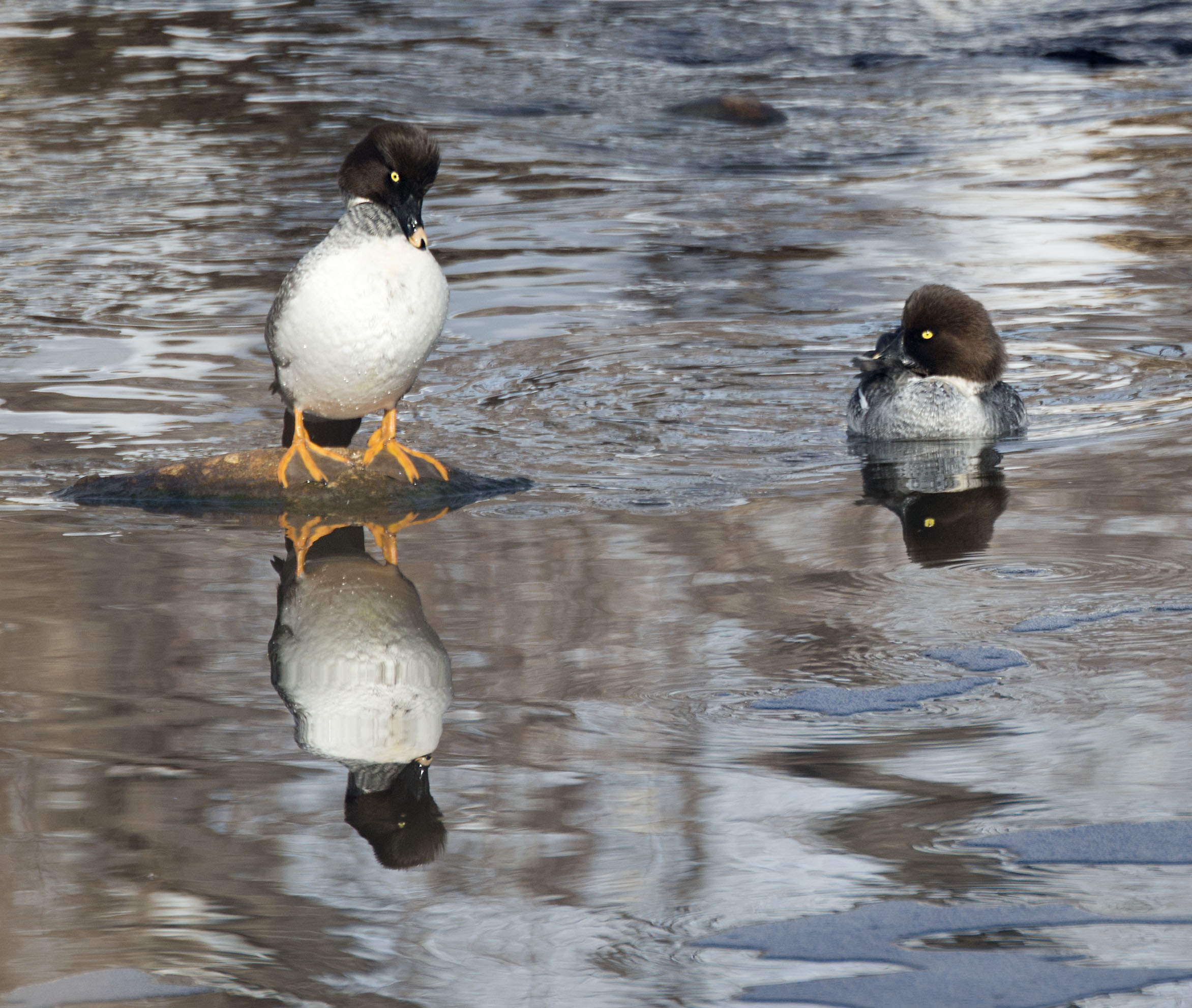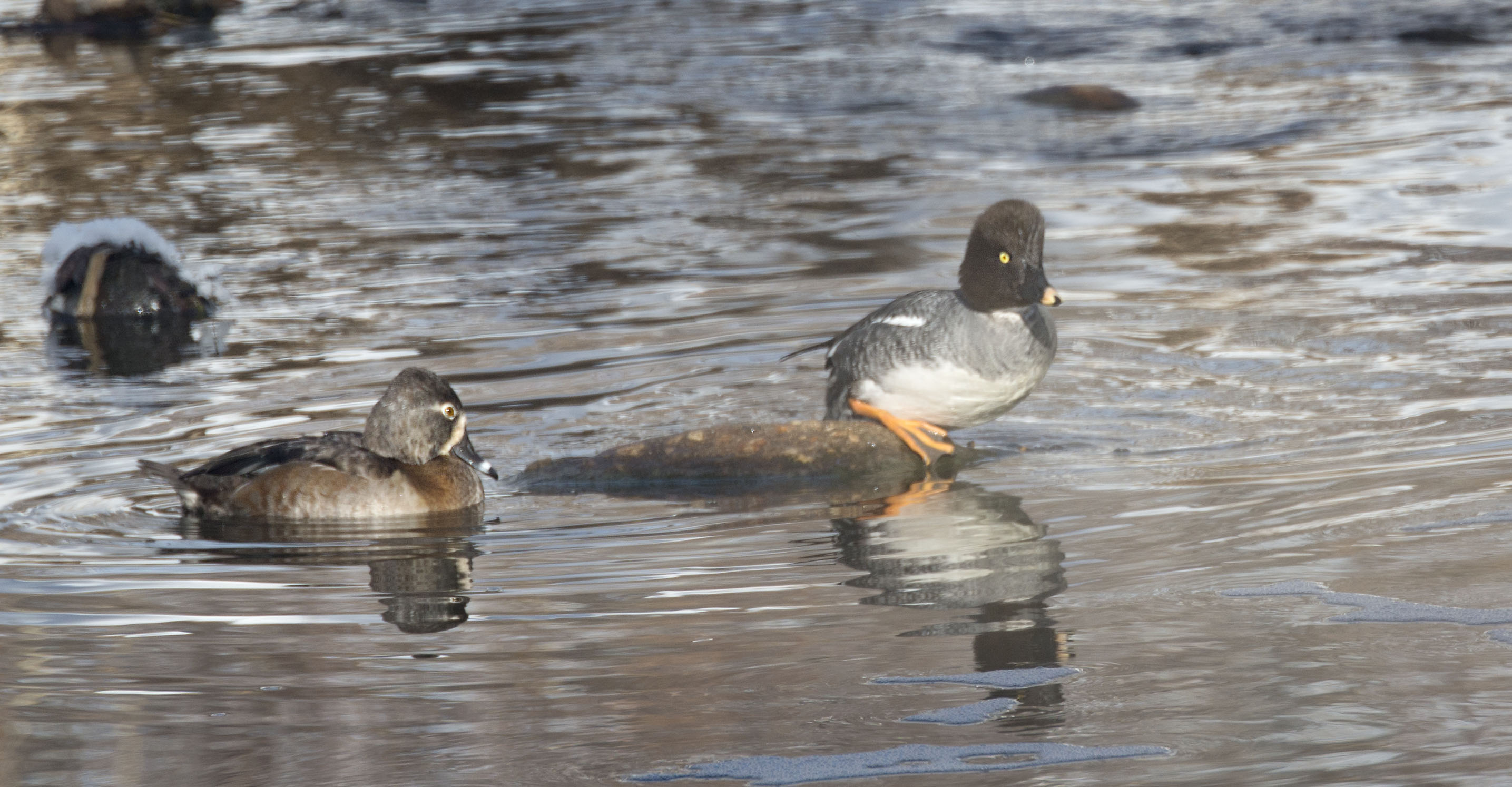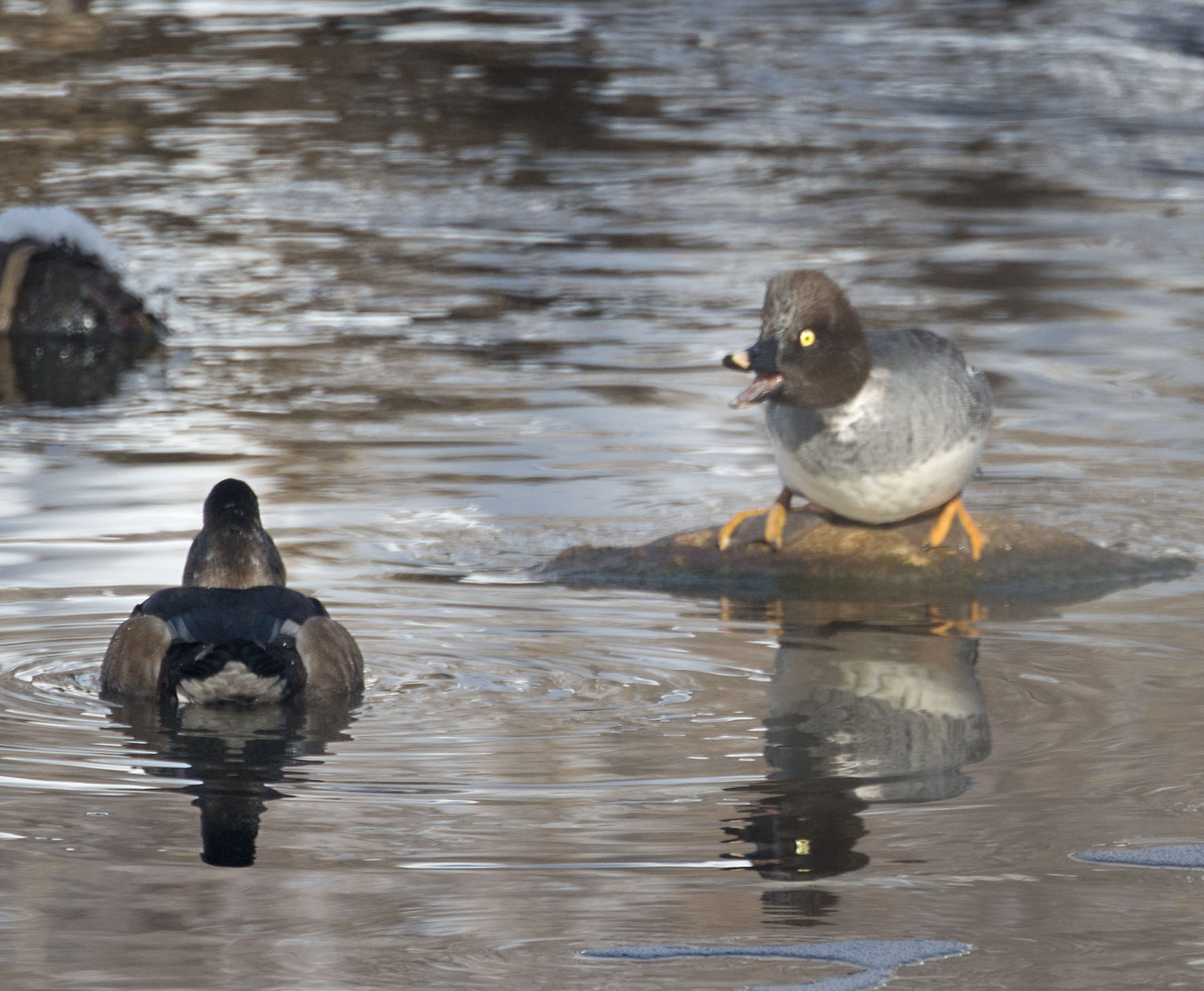 It was short and somewhat mild but was sure was a squabble nonetheless. It occurred on a sunny Sunday morning along a quiet stretch of the creek. A female Goldeneye had found just the right rock to gather a little sun and enjoy the day.