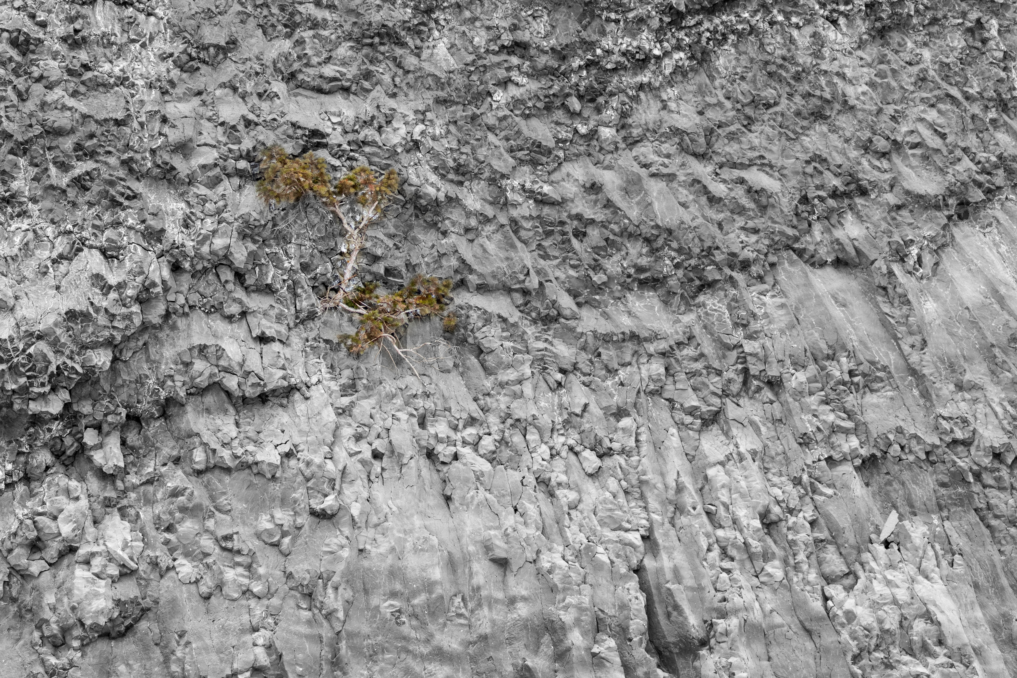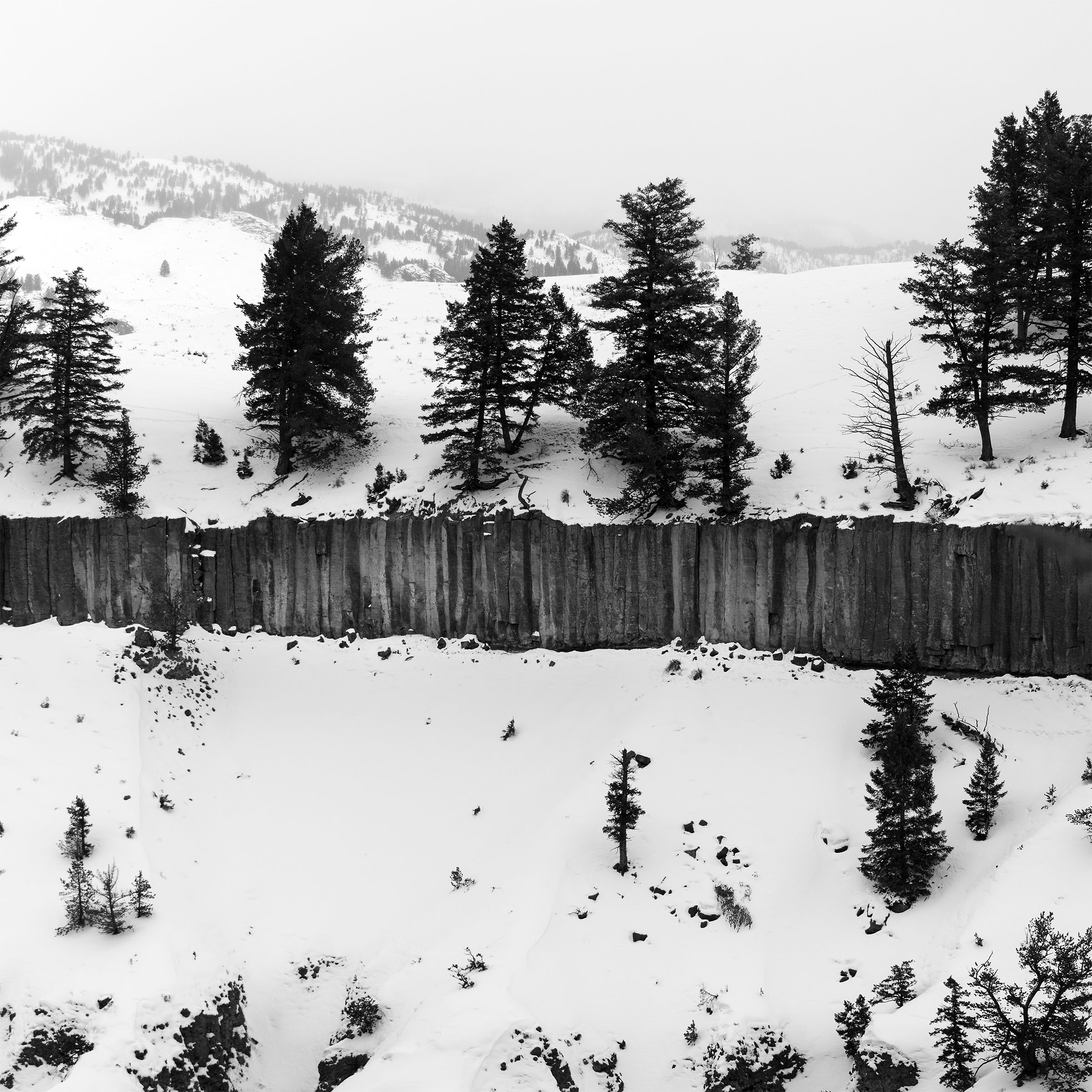 Basaltic columns sandwiched between layers of rock, earth and snow.
