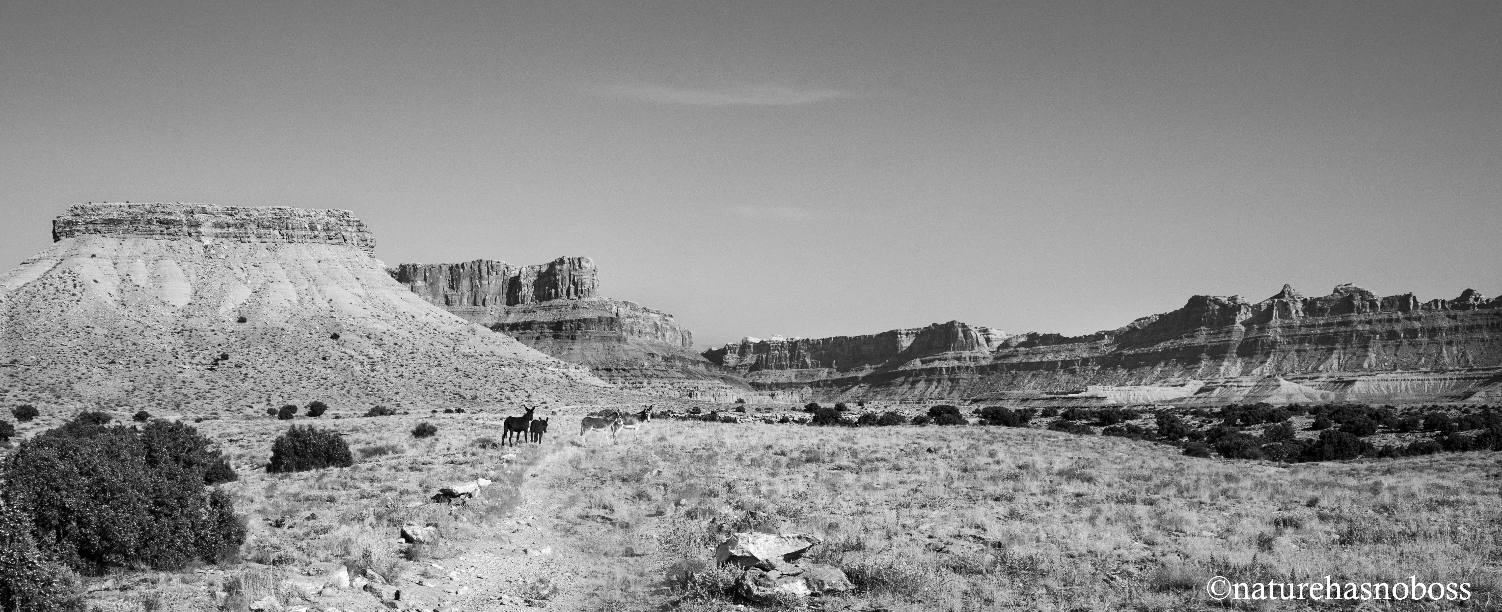 It felt like walking into an old western movie. High noon, a parched landscape, junipers, tumbleweed and a herd of wild burro roaming a landscape of bluffs, buttes and canyons.