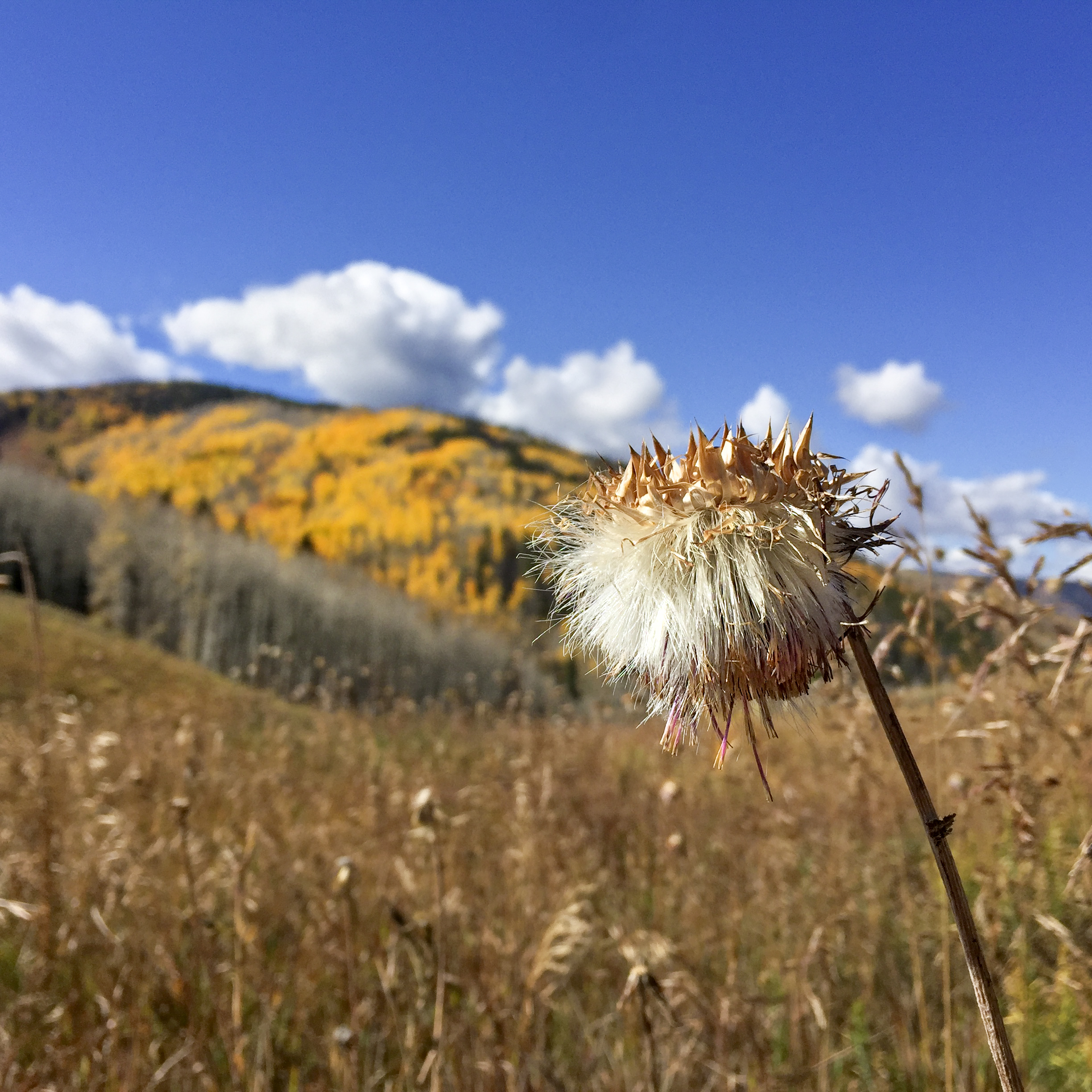 Fall seems to be lingering this year in the high county. The temperatures seem somewhat mild, the skies the bluest of blue and the Aspen trees holing onto their leaves just a little bit longer. Taking a cue from nature we lingered as well. Watching the Aspens release their leaves into the mild breezes and sitting in the fall grass looking up at thistles and blue september skies. Linger when you can because September has come and gone the days are getting ever shorter.