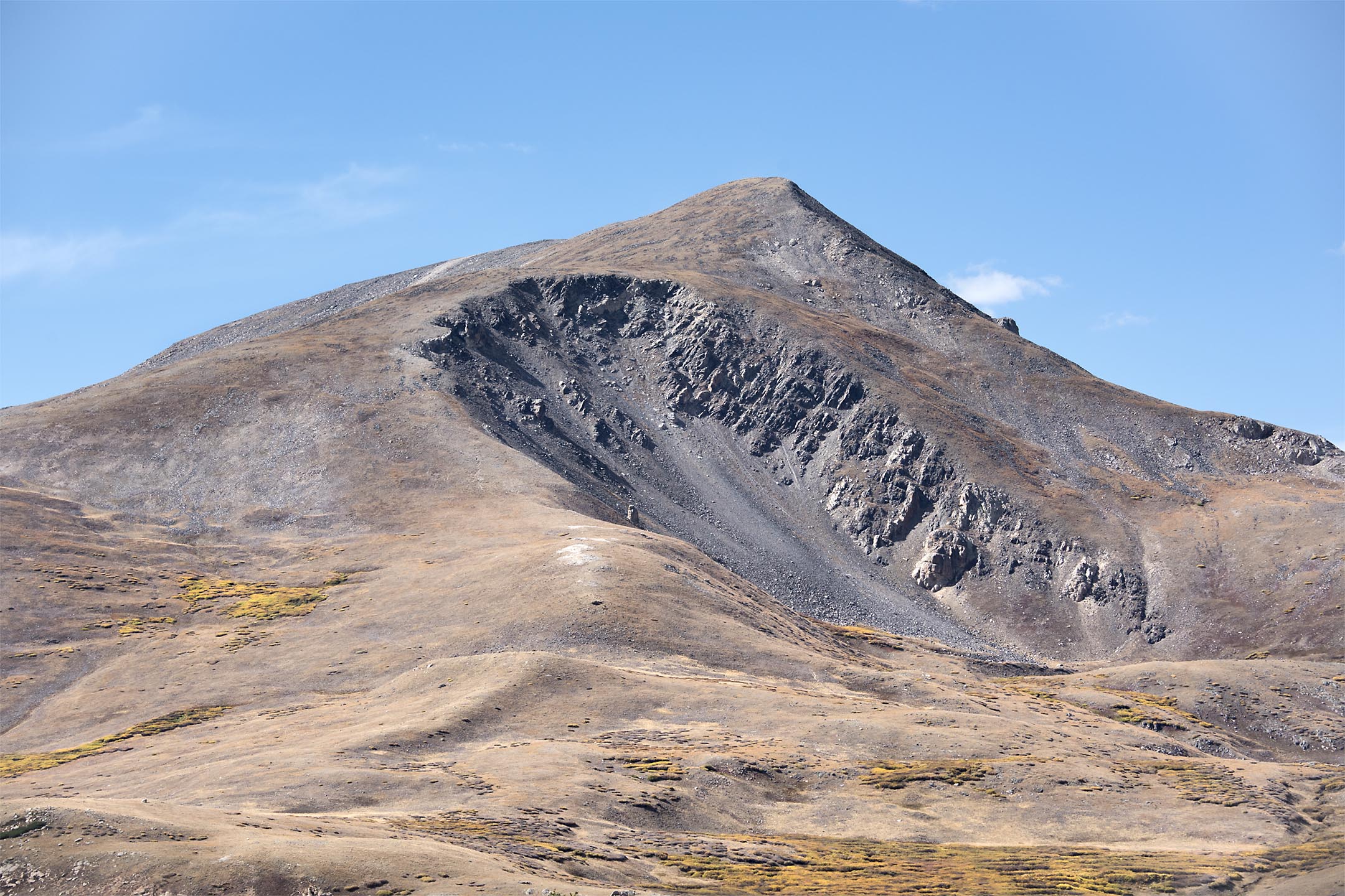 Not a cloud in the sky, the air crisp yet warm and a touch of fall color on the mountainside. Couldn’t ask for a better day. Looking up to the summit of Cinnamon Mountain in Central Colorado.