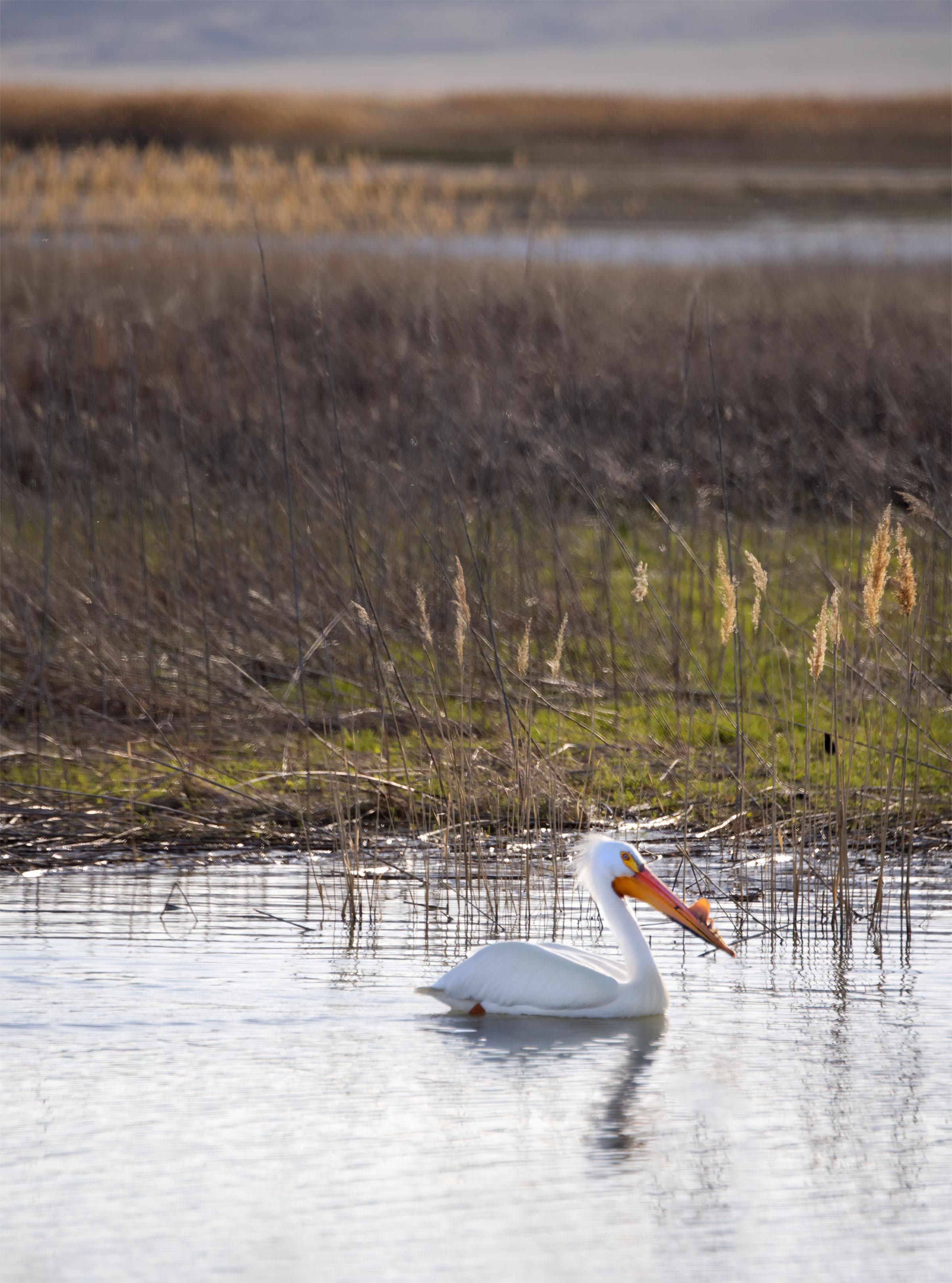 An American White Pelican enjoying a wonderful spring sunset high in the Rocky Mountains. The grass is just greening up around the edges of the lake but the Pelicans have arrived on their way to the boreal forests where many breed. A sure sign summer is on it’s way.
