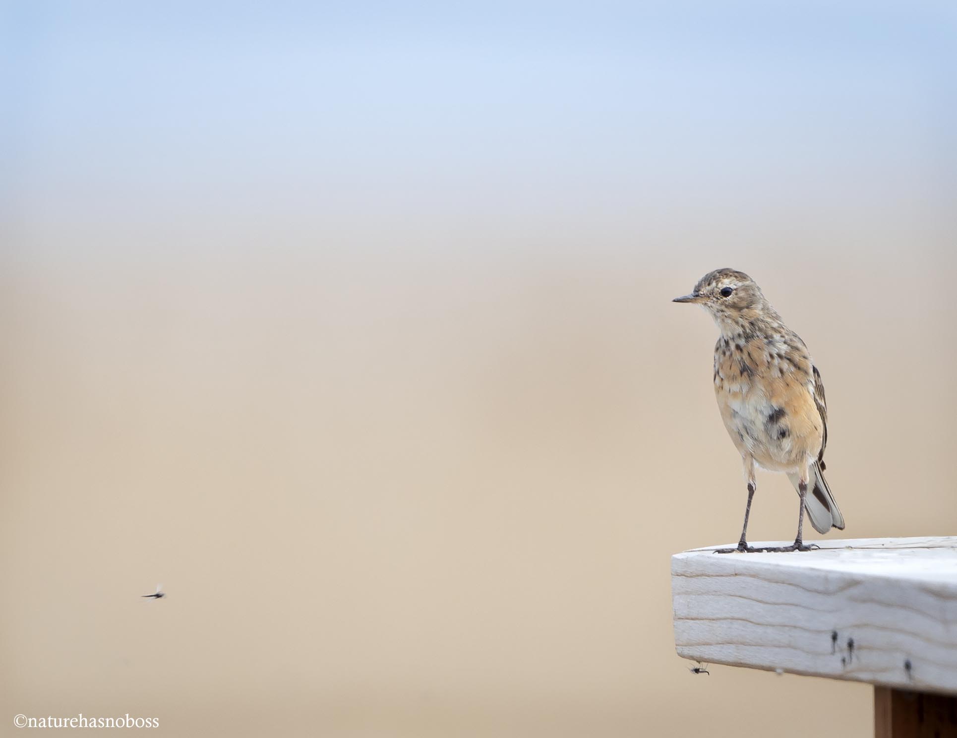 American Pipits breed on the arctic tundra as well high alpine meadows yet can regularly be observed during winter and spring migration, as was the case this day. While they sometime can be an inconspicuous looking bird the touch of peachy-orange on this bird certainly drew our attention her way as she foraged contently on a fresh hatch of spring insects.