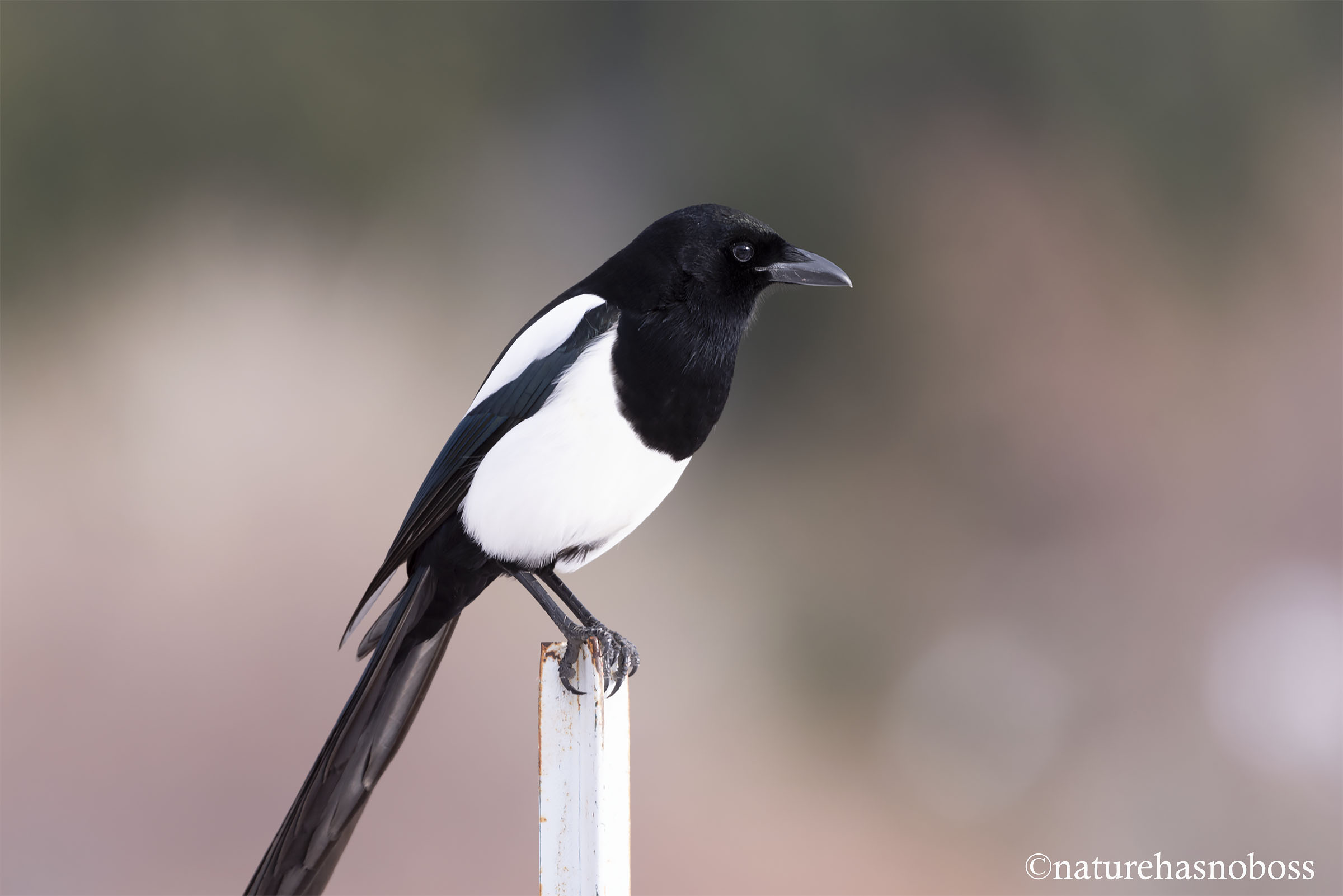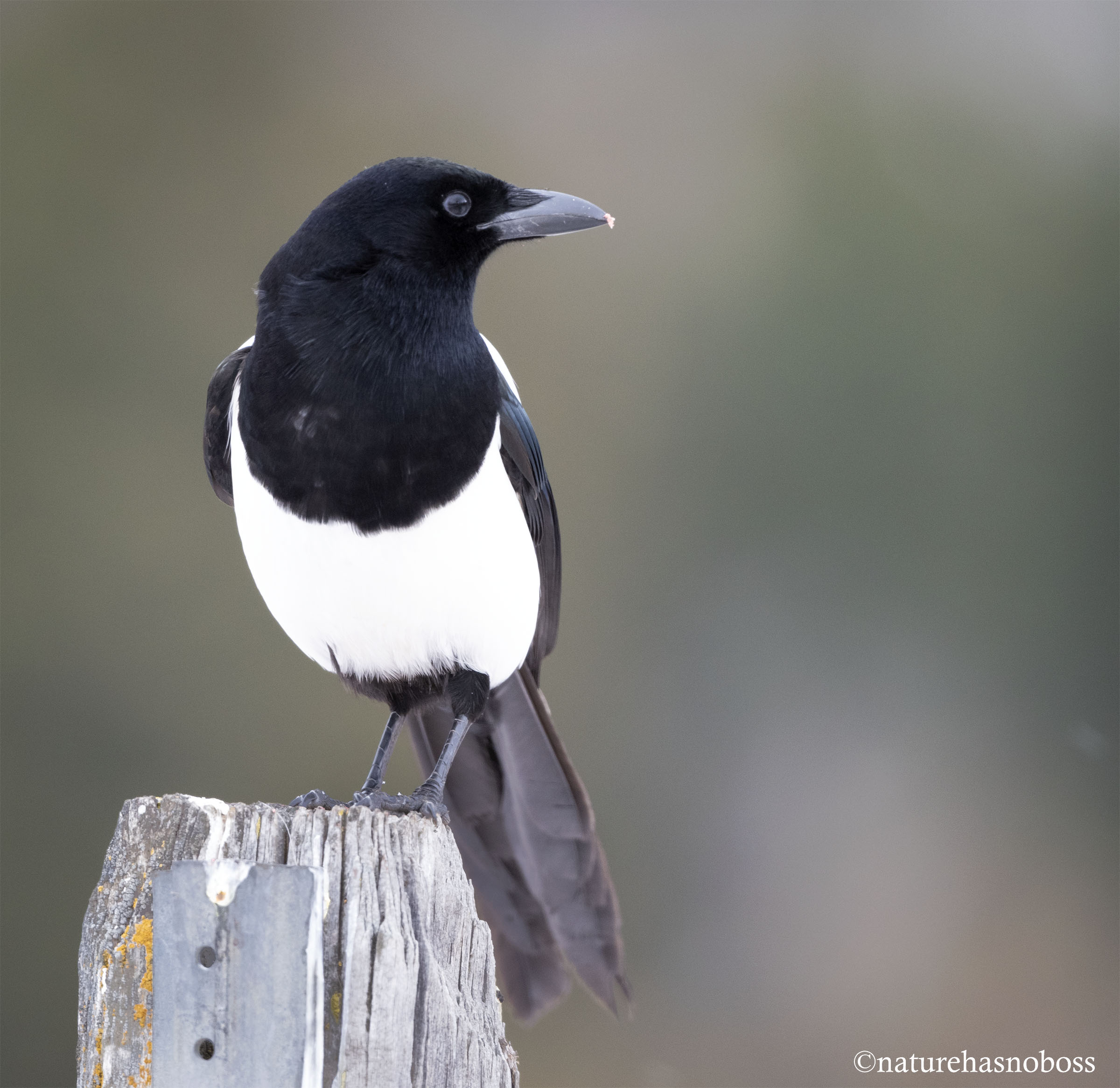 A Black-billed Magpie rests on a fencepost while over a dozen and perhaps more other Magpies feast on a Mule Deer Carcass nearby. In our neck of the woods Magpies are shy and typically fly off well before we can get a camera pointed on them. This day their attraction to the nearby feast overshadowed thier reluctance of humans and we got to observe them close-up for a significant amount of time.