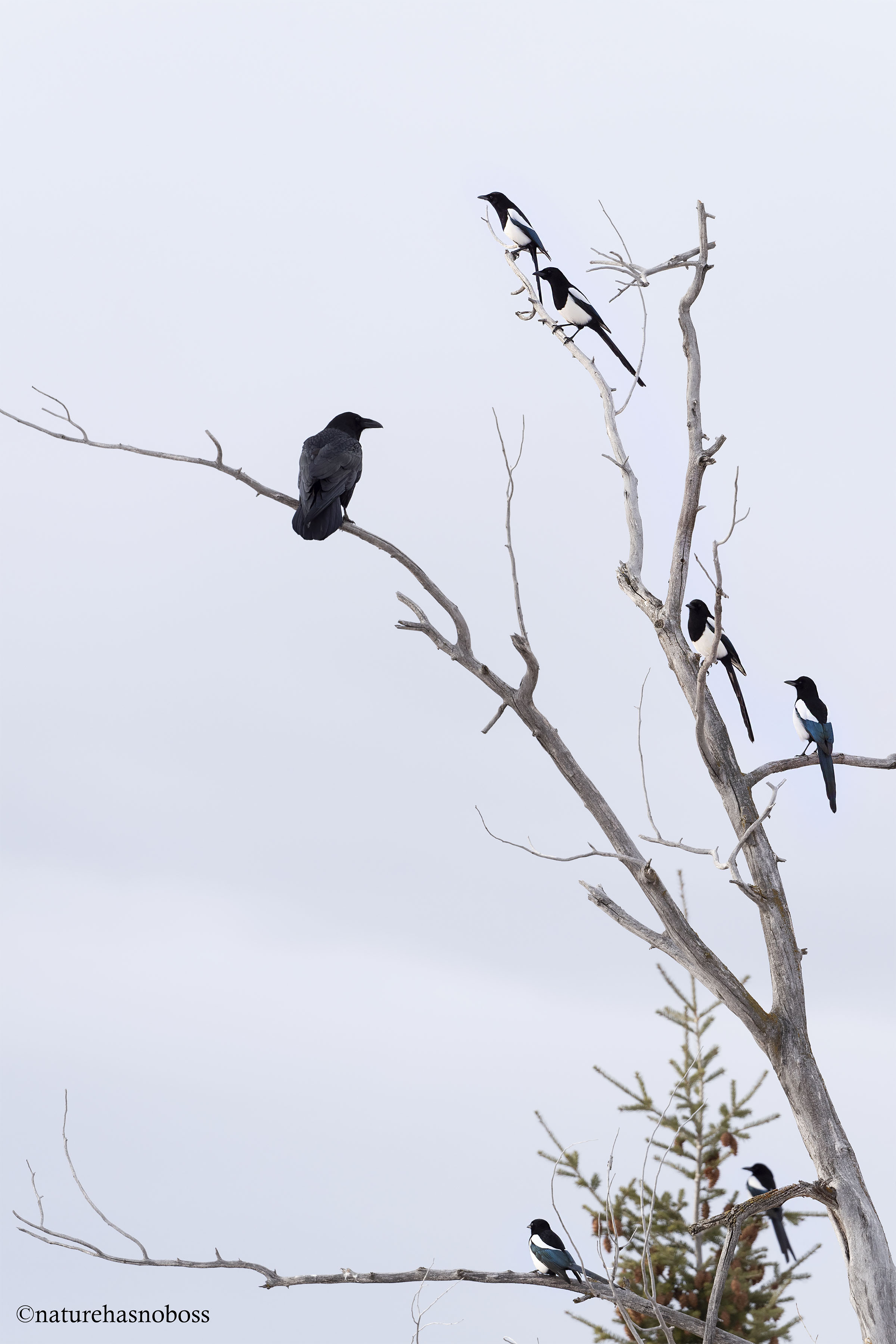 Seven Black-billed Magpies keep an eye out on a Corvid relative the Common Raven who also had an interest in the nearby Mule Deer carcass. Needless to say, a seven to one advantage kept the meal out of reach for the Raven.