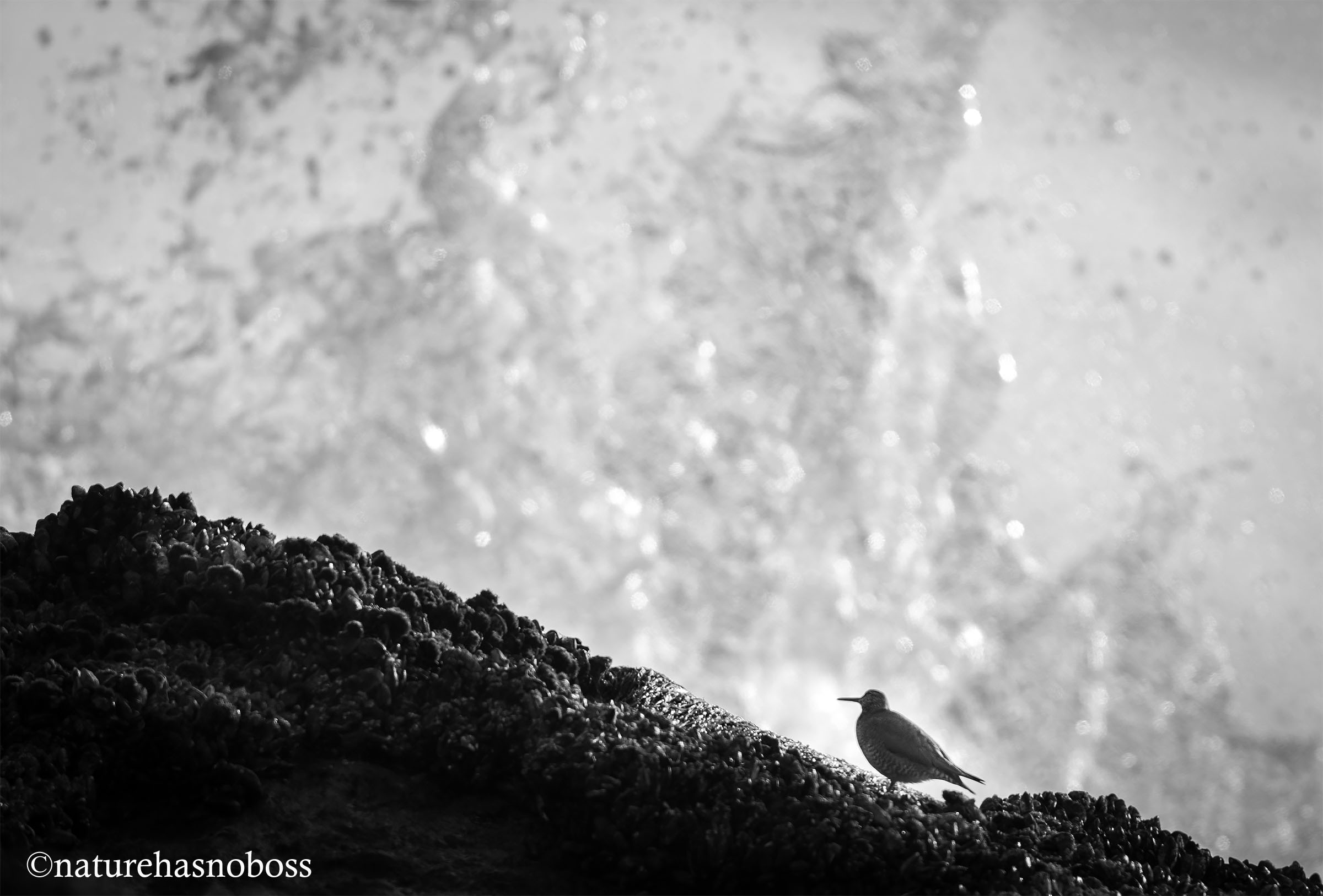 While the waves were breaking big on the rocks along the shore a Black Turnstone takes it all in stride while foraging on a mussel crusted rock.