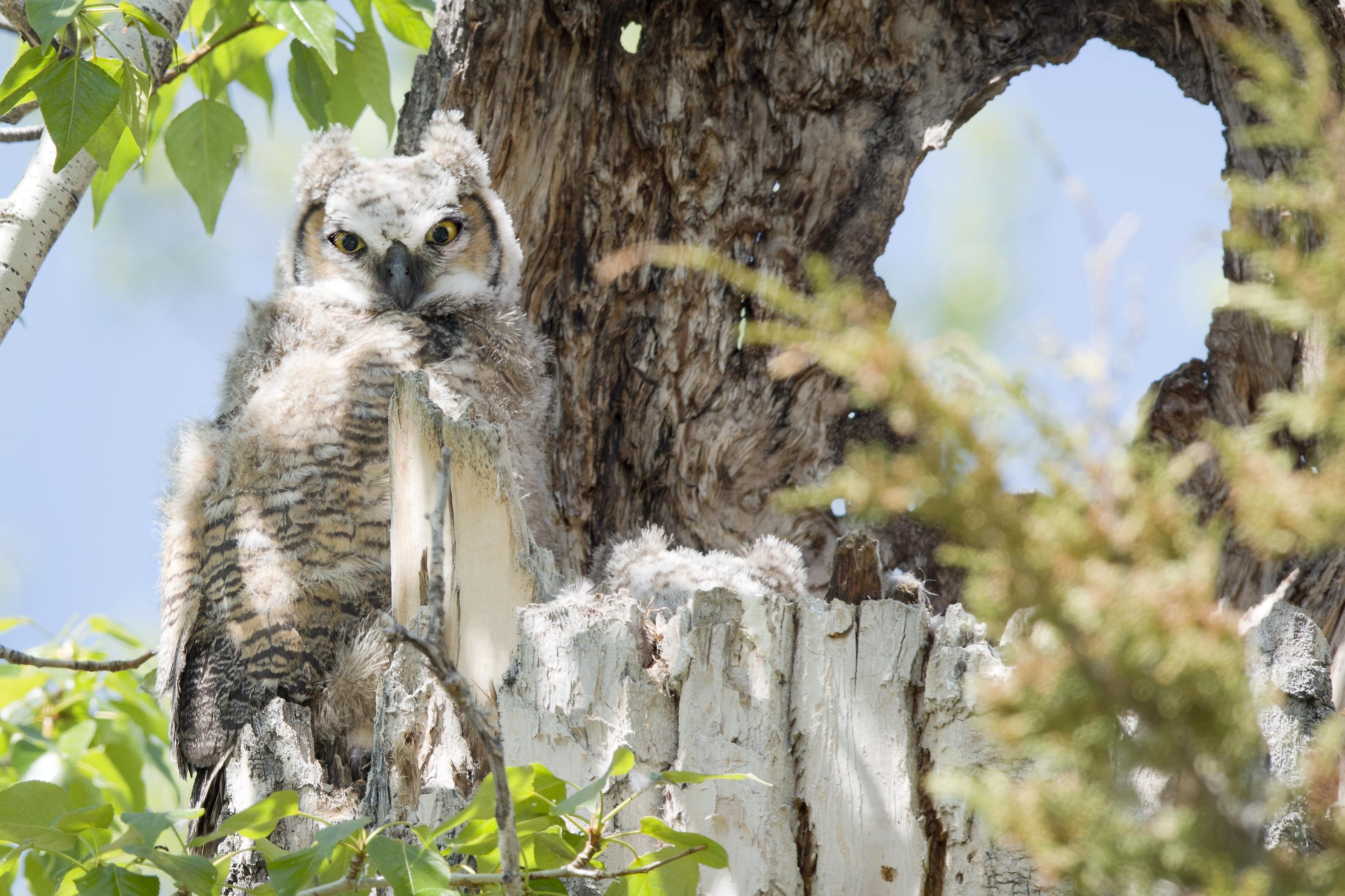 Owlets On August 7, 2014August 7, 2014 By Mike and Christy22 Comments A pair of great horned owlets. One shy and one not so shy staying close to home in a beautiful old cottonwood tree.