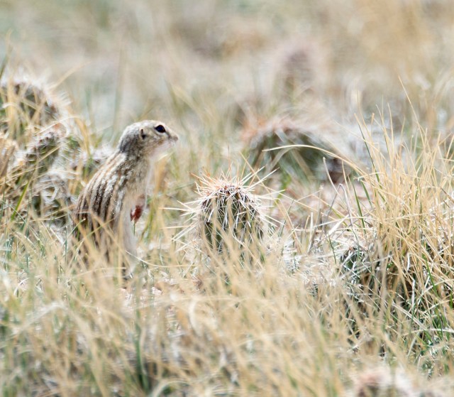 The photo is a bit blurry but so was our encounter with the 13 Lined Ground Squirrel. We were watching a Prairie Dog Colony and there was one Prairie Dog that just did not seem like the others. He was thinner and smaller. They would stand up tall and then quickly dart to another location very rapidly. They were much more hidden in the grass as well. We tried over and over to get a good look but this is the best we got that afternoon. A fleeting glimpse of a magnificent 13 lined ground squirrel.