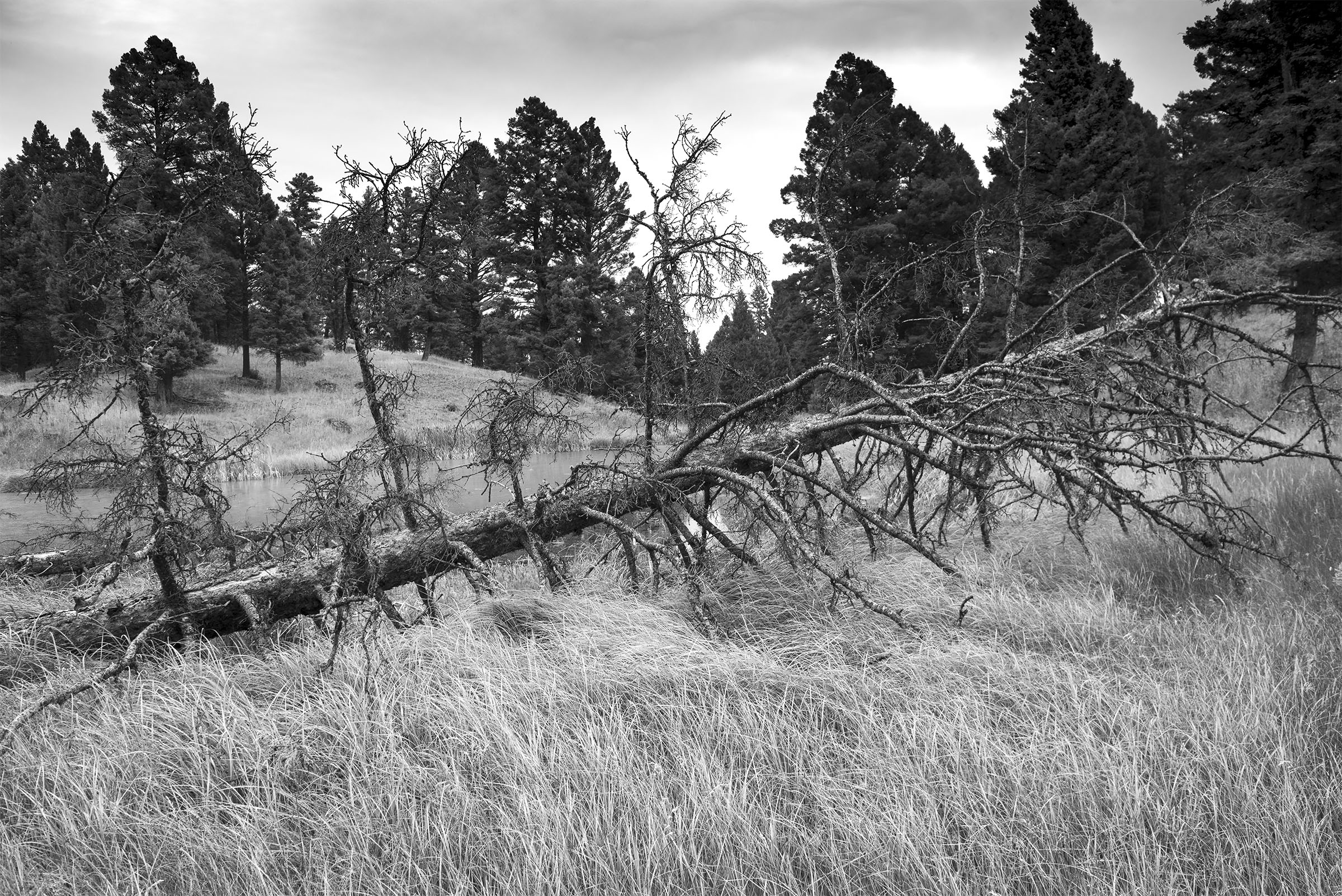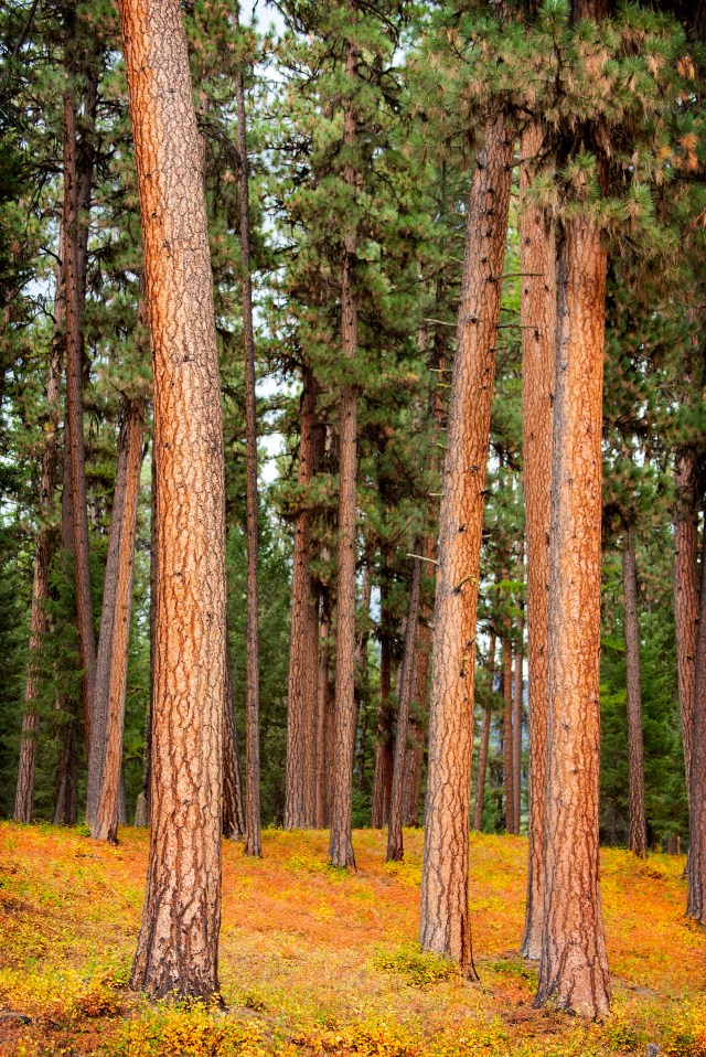 While driving an old road in an area where recent fires scorched much of the forest we happened upon a stand of wonderful old Ponderosa Pines still standing tall with wonderful fall colors below and showing off that wonderful orangish bark that only wise old Ponderosas have.